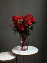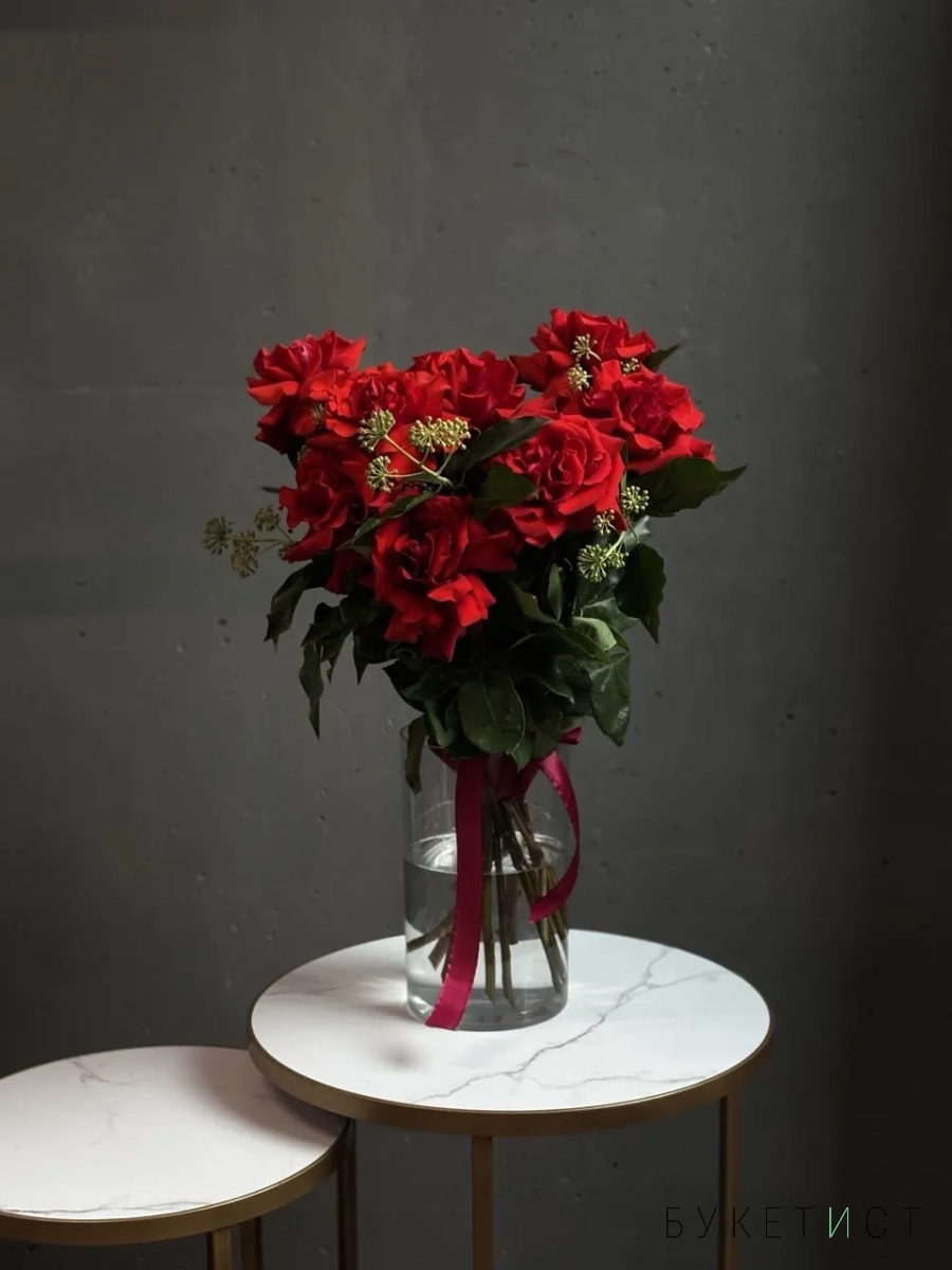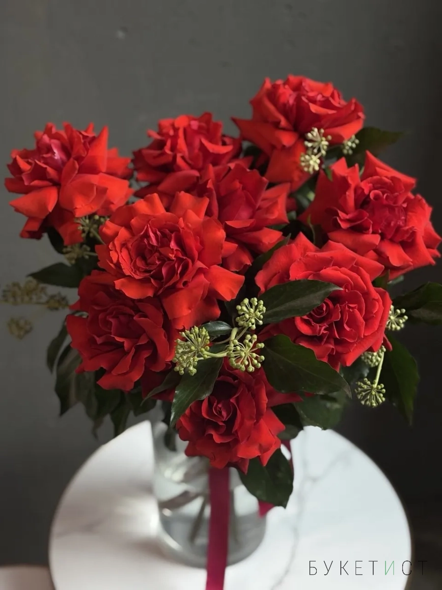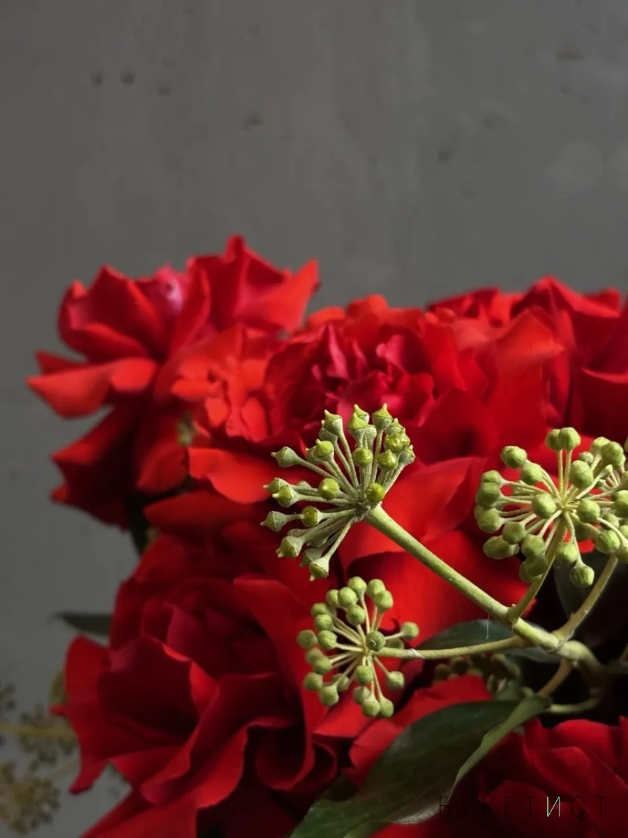 Букет упакован в стильную бумагу и перевязан атласными лентами. В стоимость букета входит декоративная упаковка, атласная лента, индивидуальная влажная упаковка.