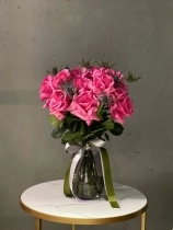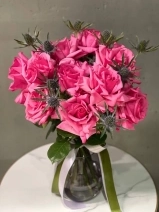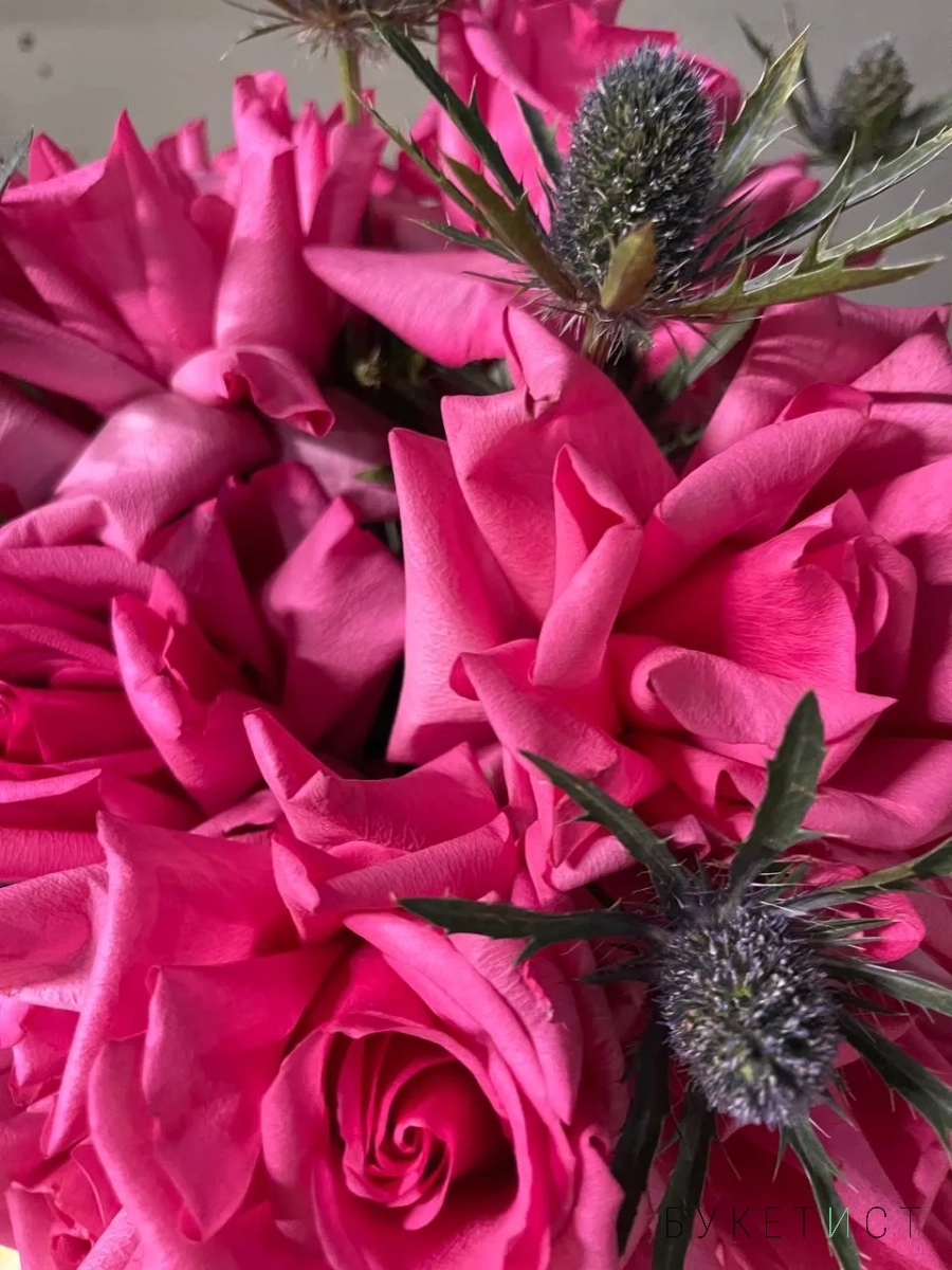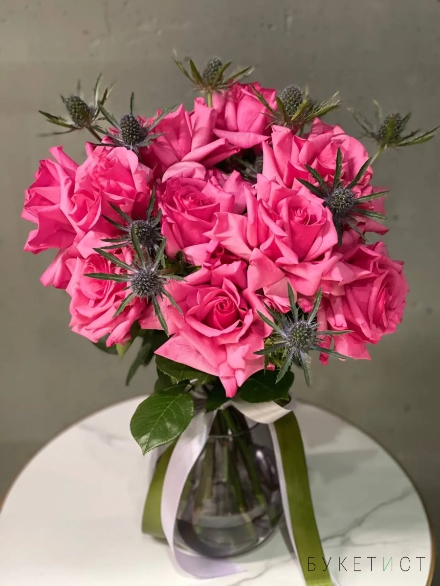 В составе букета: 11 стеблей ярких ажурных роз и необычный эрингиум.