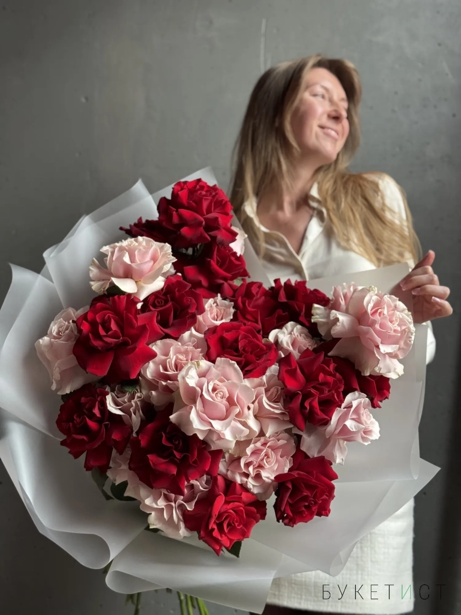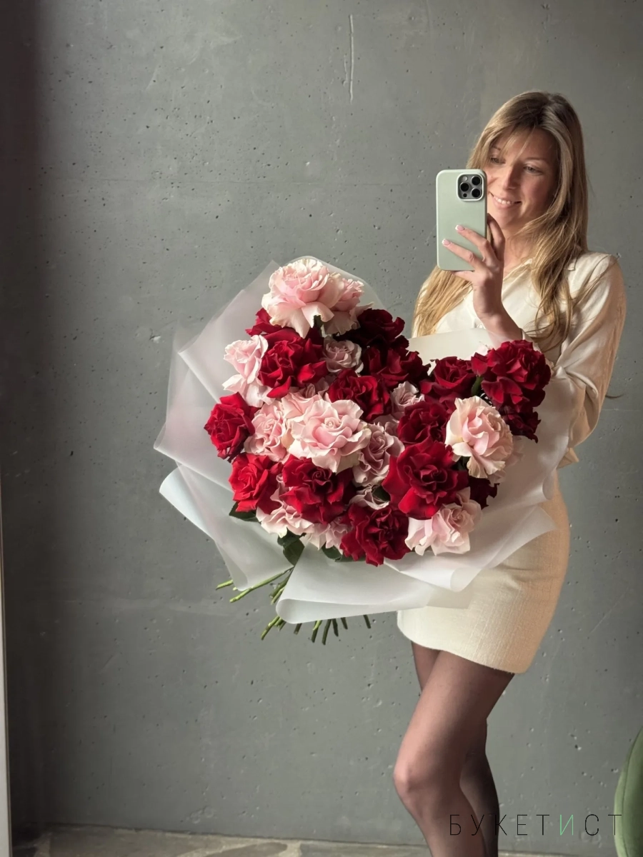 Монобукет из 35 роз премиум-сорта Nina и Pink Mondiale (Эквадор). Букет собран в разновысотной технике, а каждый лепесток розы вывернут вручную - так создается объем и особый эффект "кружева".