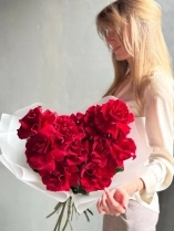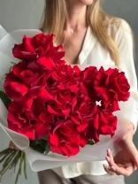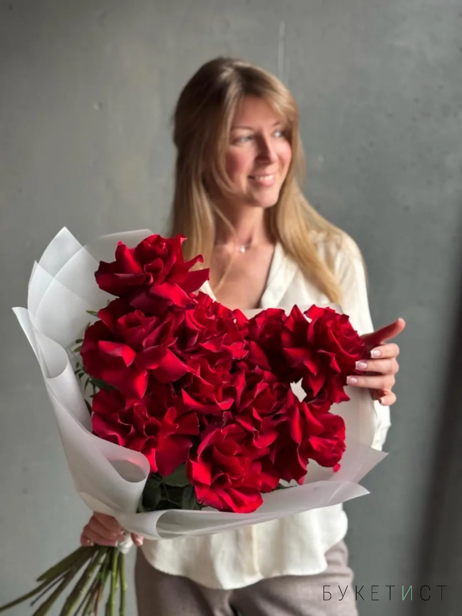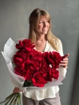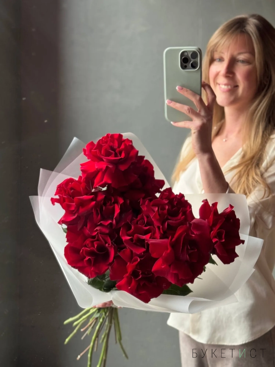 Монобукет из алых роз премиум-сорта Explorer. Букет собран в разновысотной технике, а каждый лепесток розы вывернут вручную - так создается объем и особый эффект "кружева". На фото представлен букет из 11 стеблей. Прелесть, не правда ли?