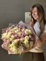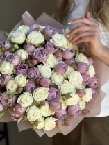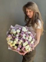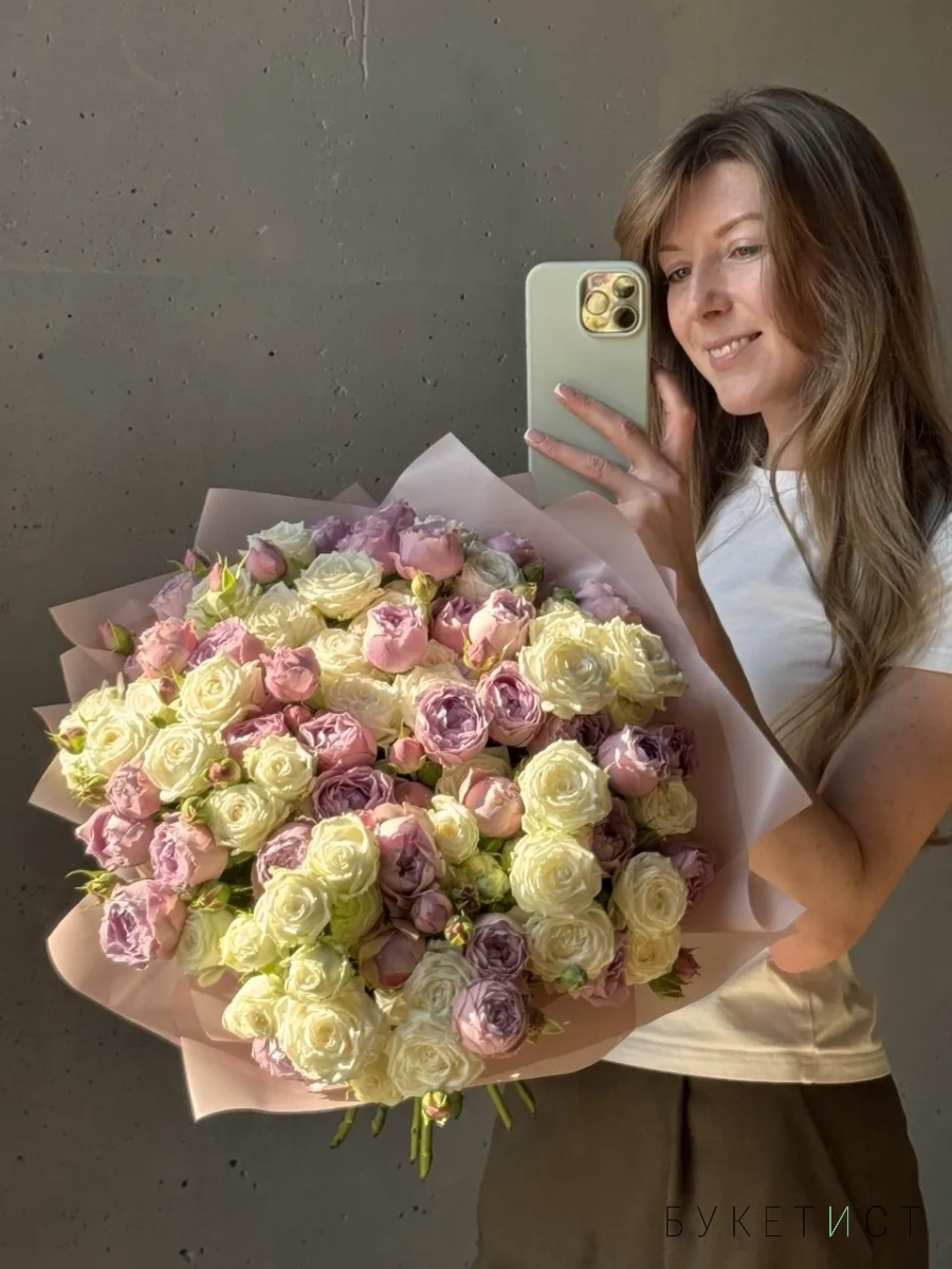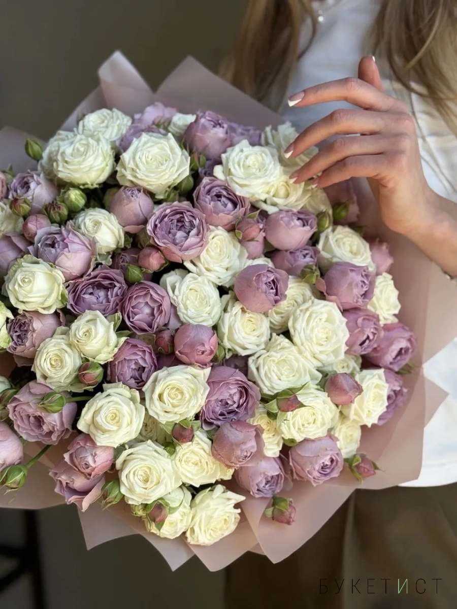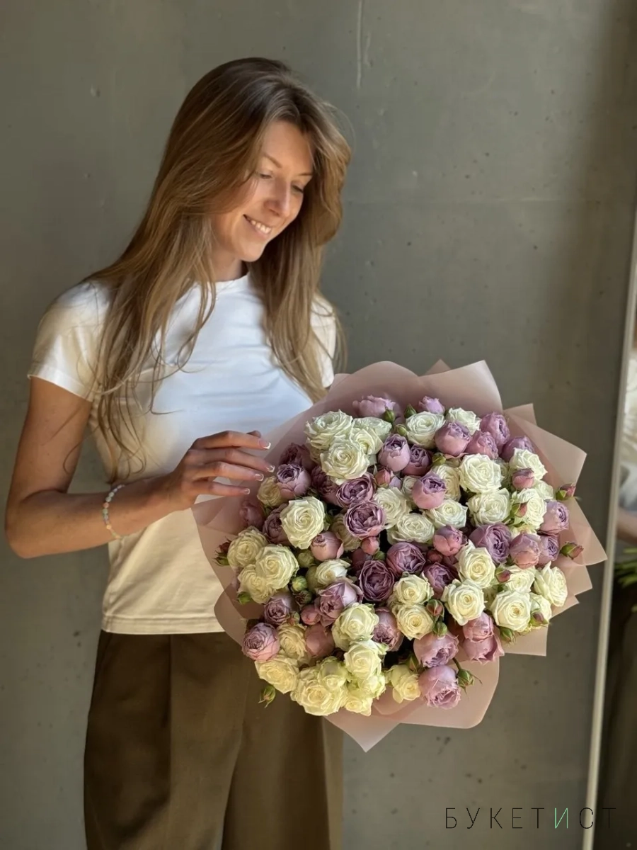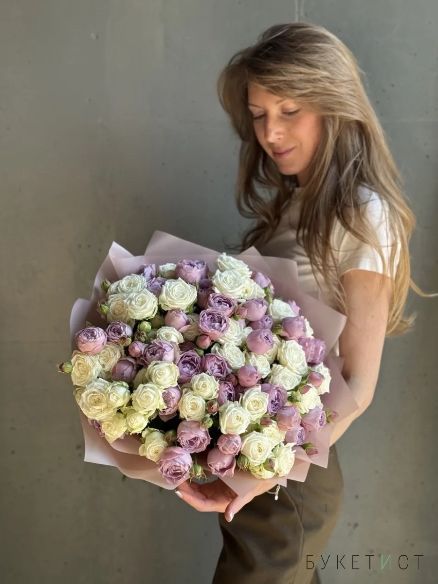Монобукет из белоснежной пионовидной розы сорта Мисс Бомбастик и Лавандер. На каждом кустовом стебле пионовидной розы — 2–3 бутона, поэтому цветов визуально гораздо больше, чем стеблей. Прелесть, не правда ли?