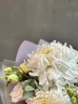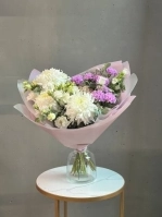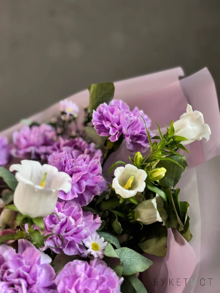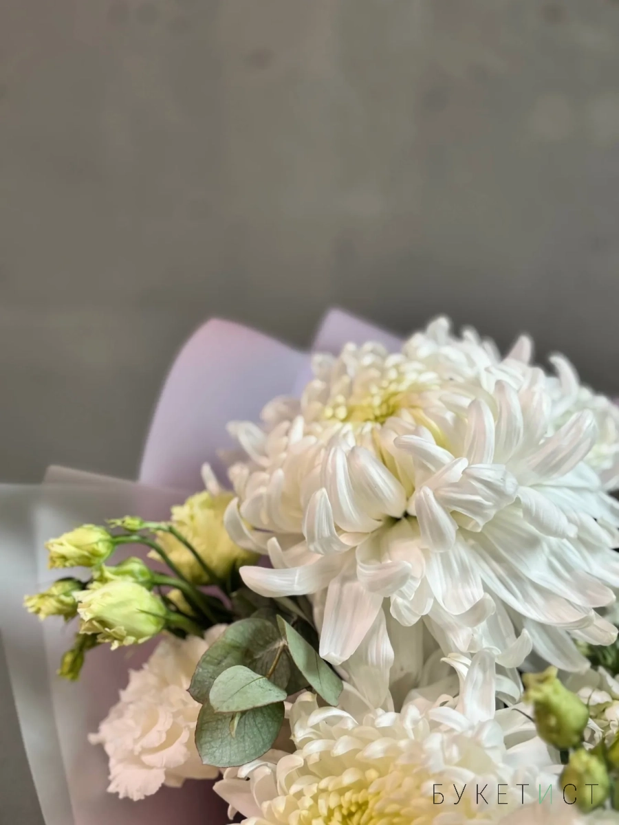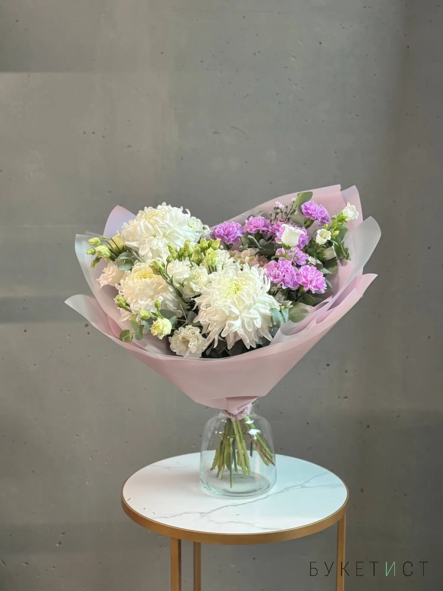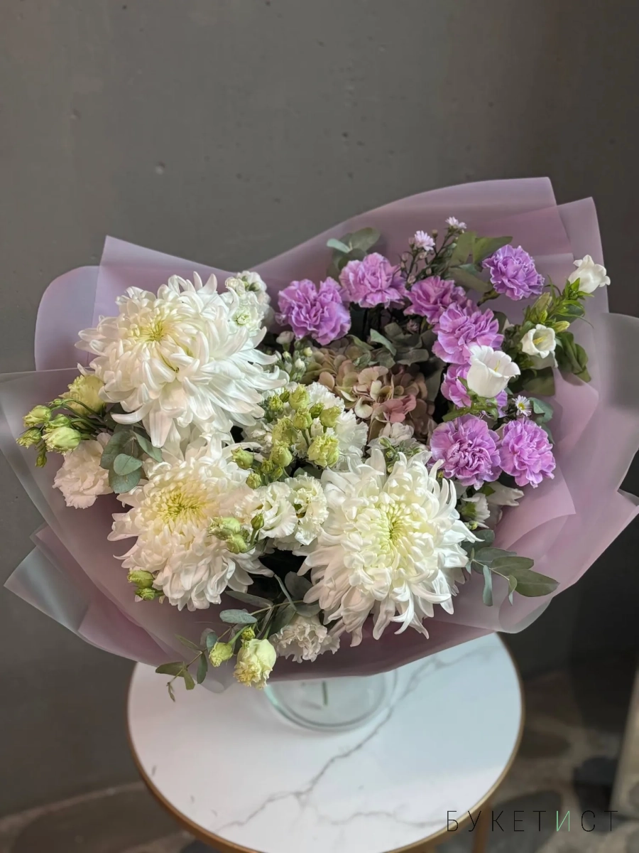 В составе: хризантема сорта Магнум, эустома, гвоздики, кампанула, астер, веточки эвкалипта.