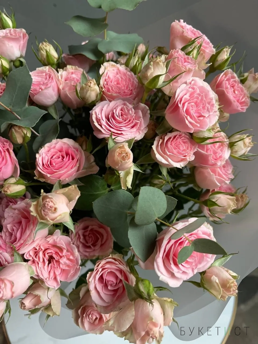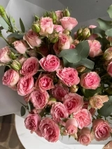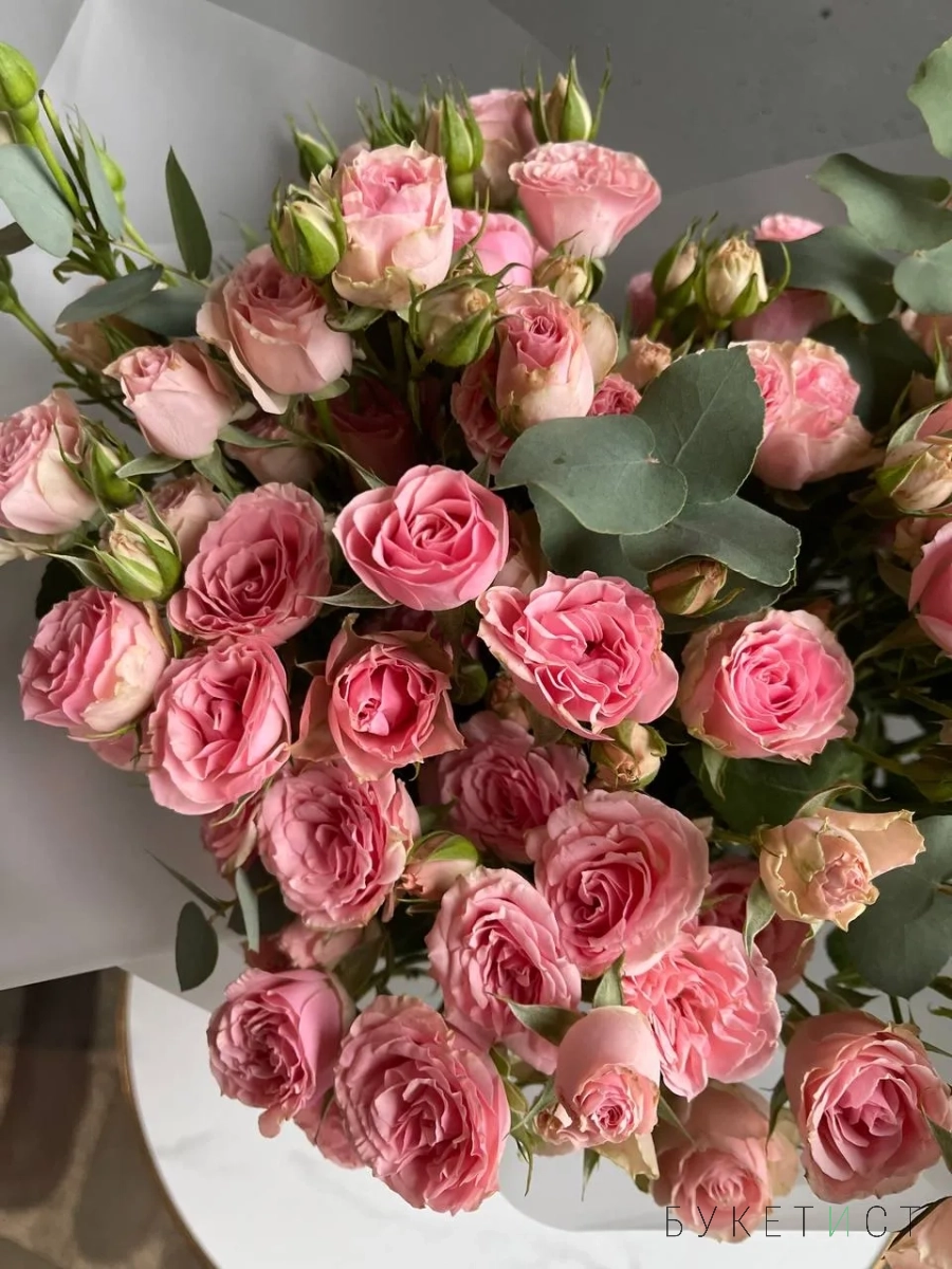 В составе букета: 11 стеблей кустовых роз сорта Беби Фоллис с эвкалиптом.