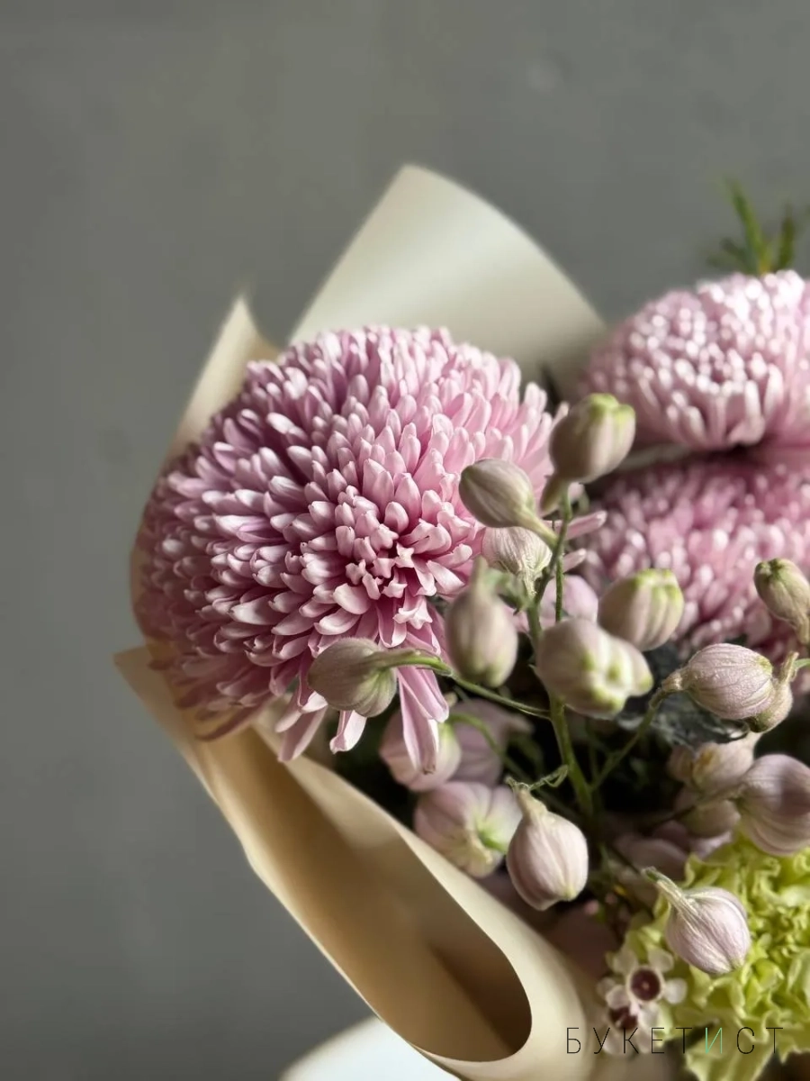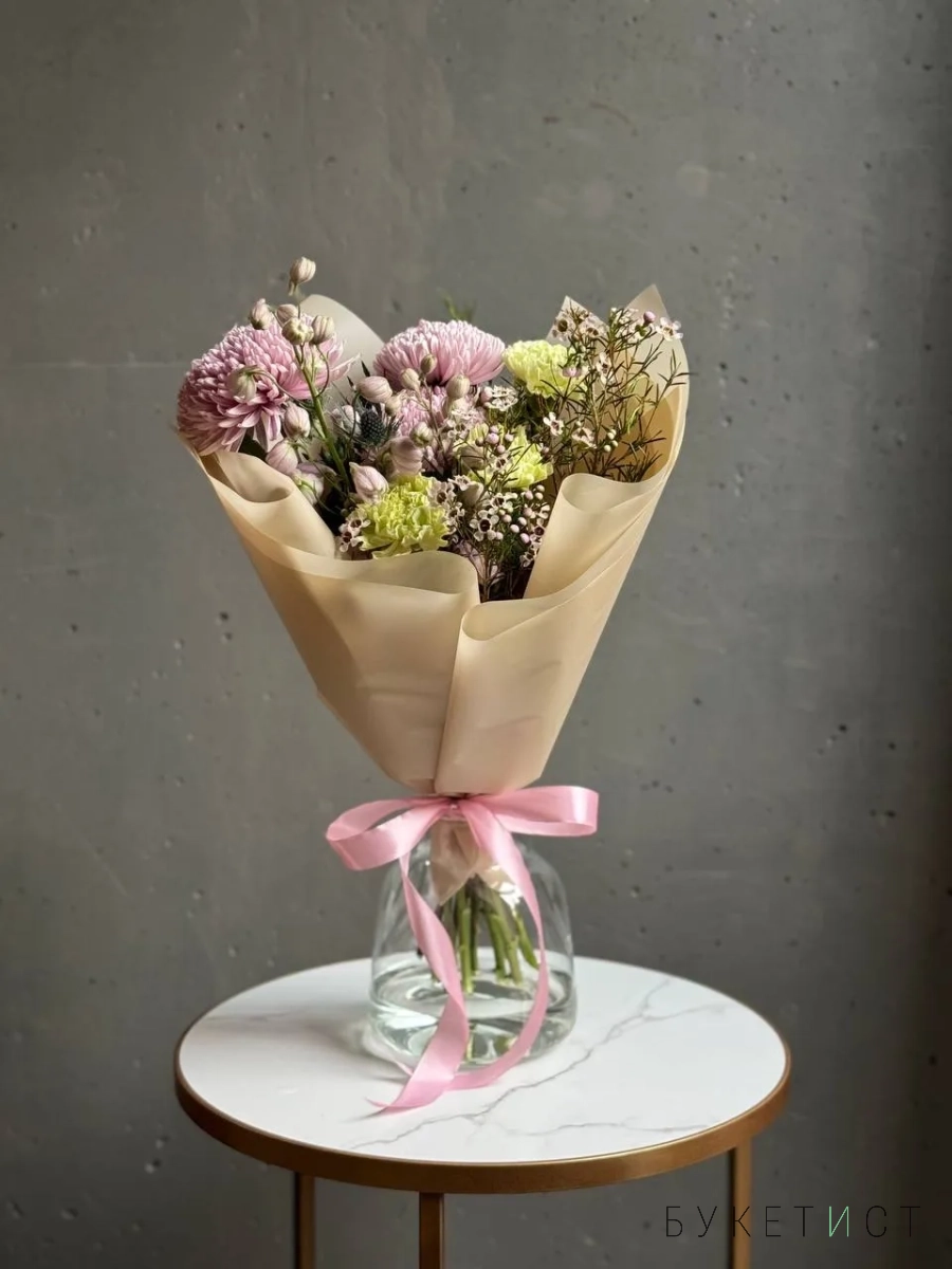 Букет упакован в стильную бумагу и перевязан атласными лентами. В стоимость букета входит декоративная упаковка, атласная лента, индивидуальная влажная упаковка.