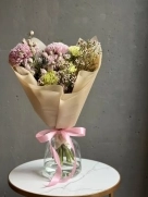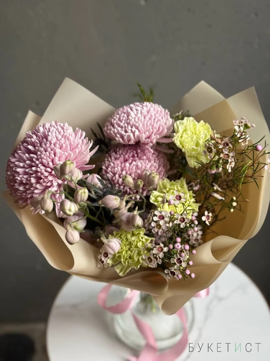 В составе: лавандовый дельфиниум, зефирная хризантема, гвоздики мохито, эрингиум и воздушный хмелациум.