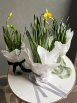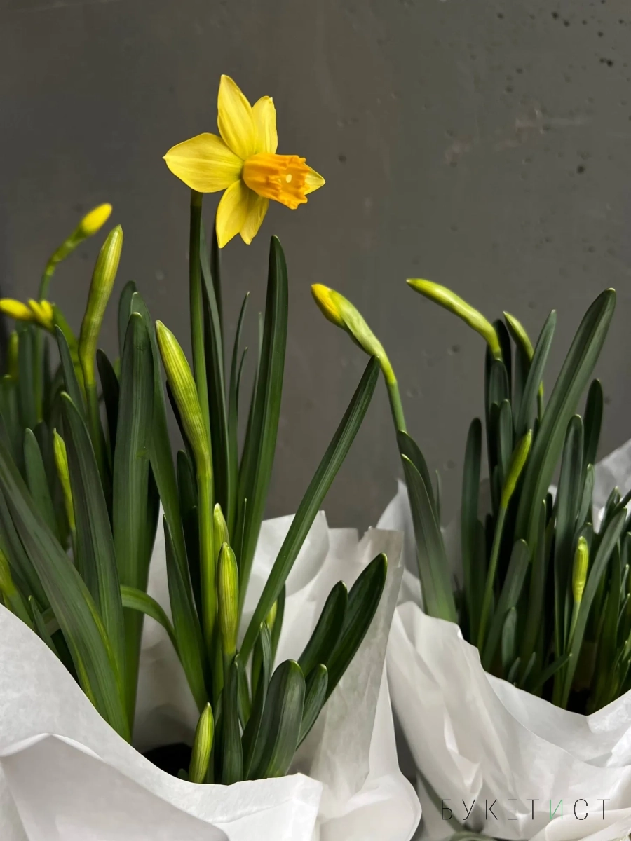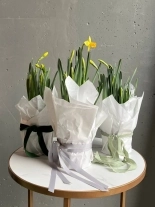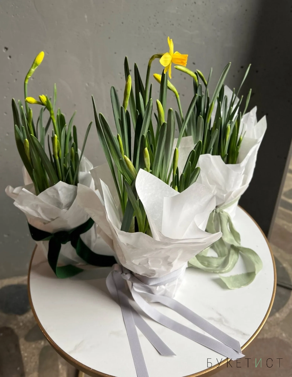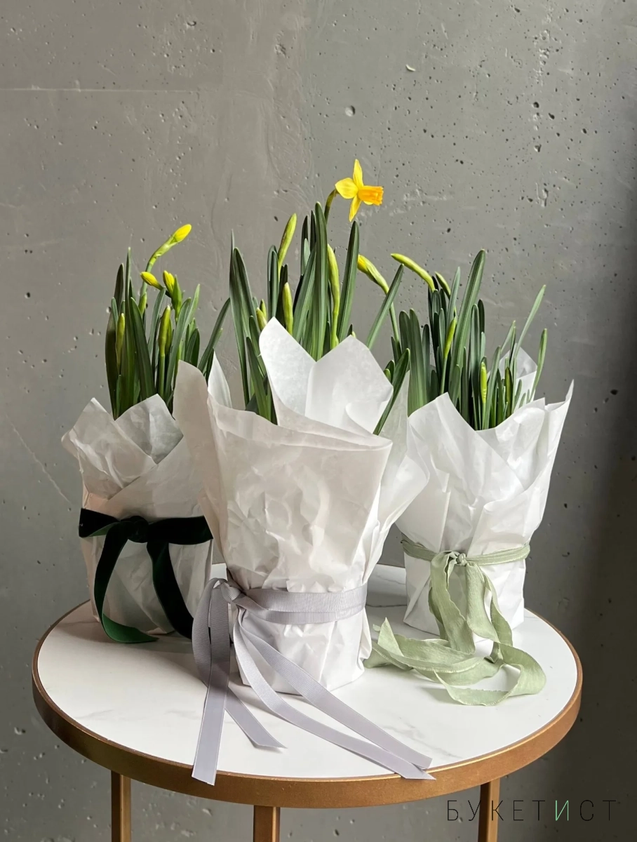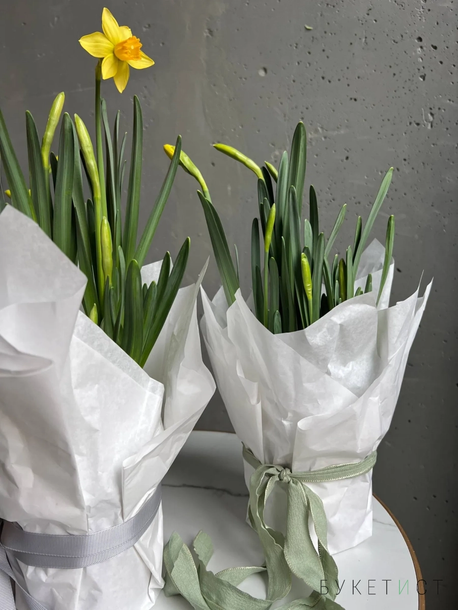 Нежная весенняя композиция из луковиц нарциссов, аккуратно завернутая в тишью, — это не просто букет, а маленькое чудо с продолжением!