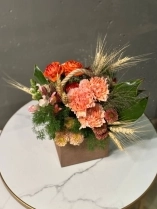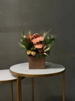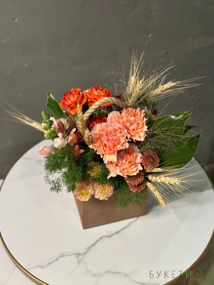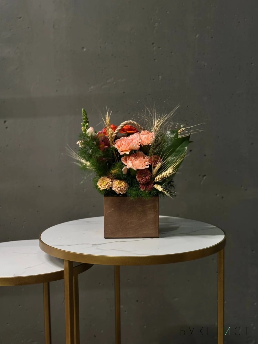 Композиция собрана в стильном деревянном ящике, цветы находятся в оазисе (флористическая губка).