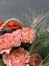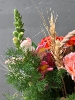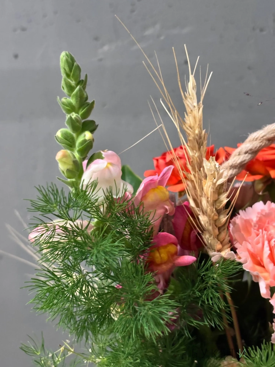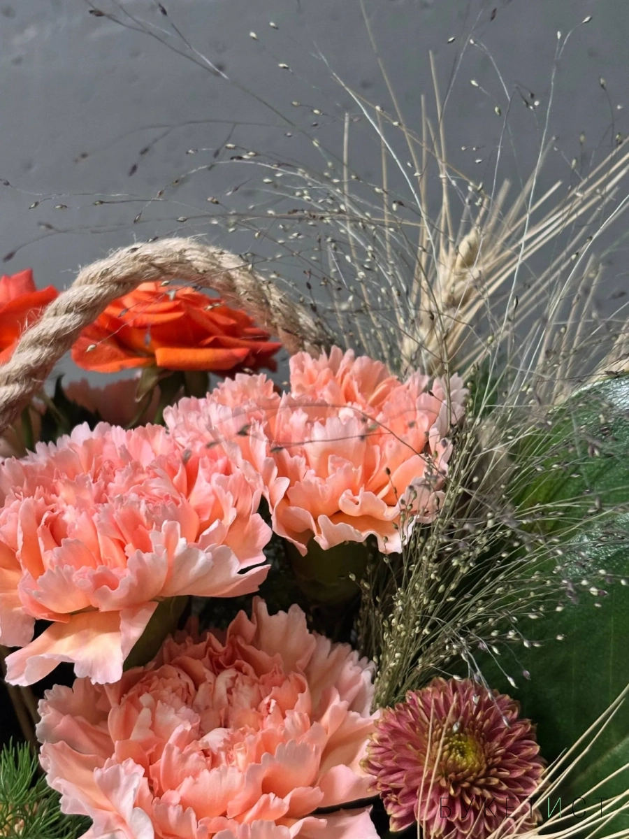 Состав букета: гвоздики, хризантема, леувенбек, аспарагус, кустовые розы, паникум, листья магнолии, пценица.
