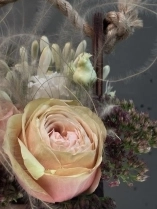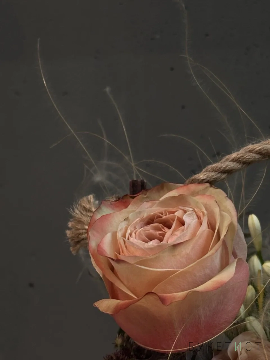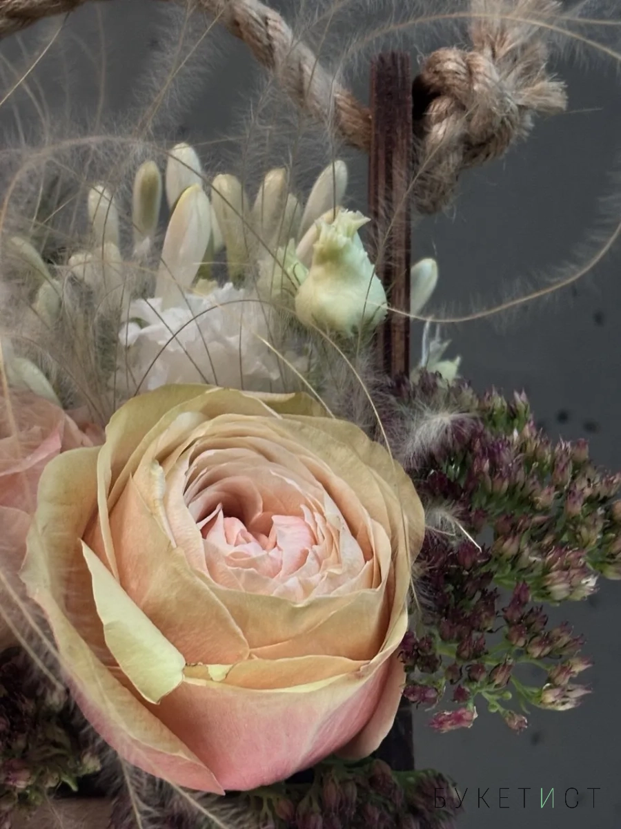 Состав букета: пионовидная роза сорта Кахала, агапантус, седум, стифа.