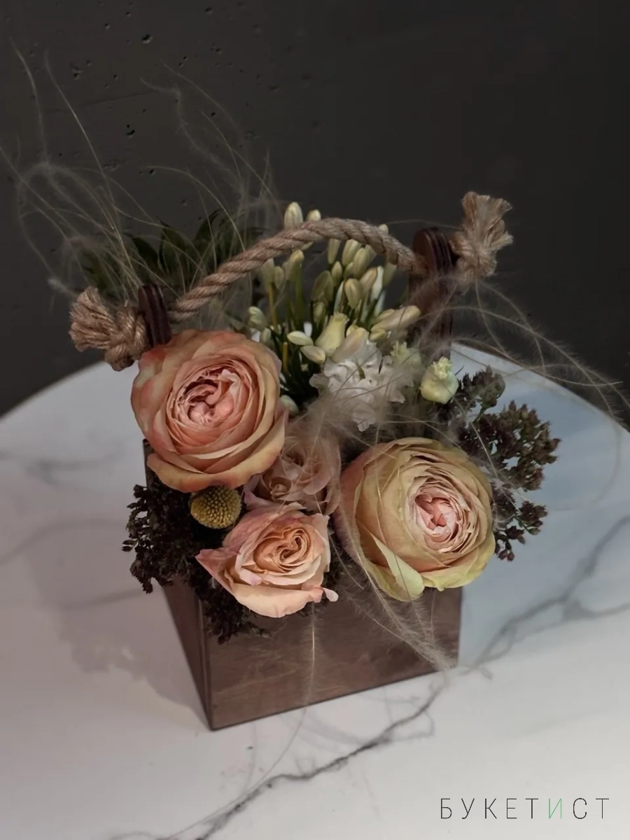 Деревянный ящик является частью композиции и продается вместе с цветами.
