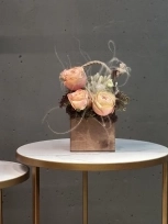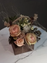 Композиция собрана в стильном деревянном ящике. Цветы установлены в оазис (флористическая губка), требуют умеренного полива каждый день.
