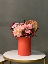 Композиция в яркой коробке. Цветы установлены в оазис (флористическая губка), требуют умеренного полива каждый день.