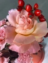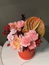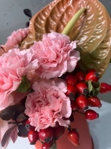 Состав композиции: необычный антуриум, одноголовый и кустовой диантусы, ажурная роза сорта Эрмоса, кустовая хризантема, ягоды шиповника и веточки барбариса.