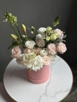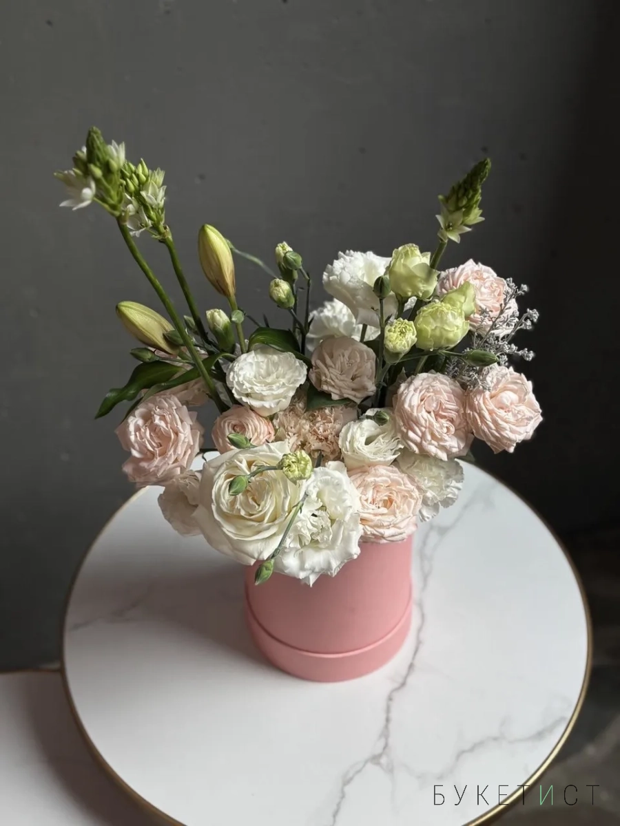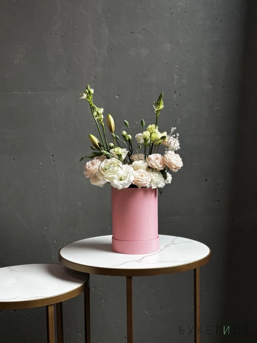 Шляпная коробка является частью композиции и продается вместе с цветами.