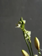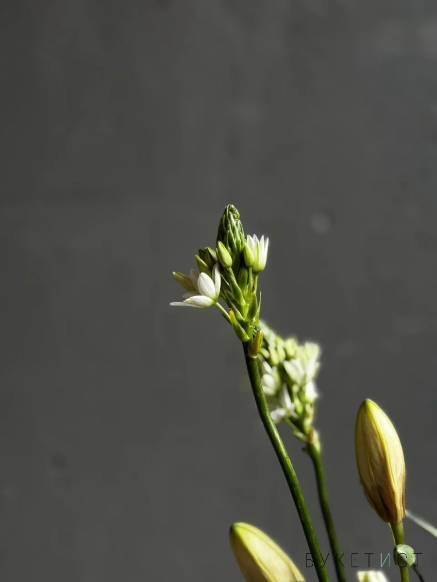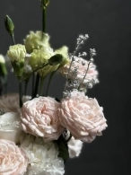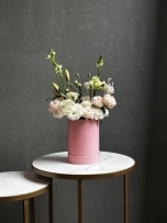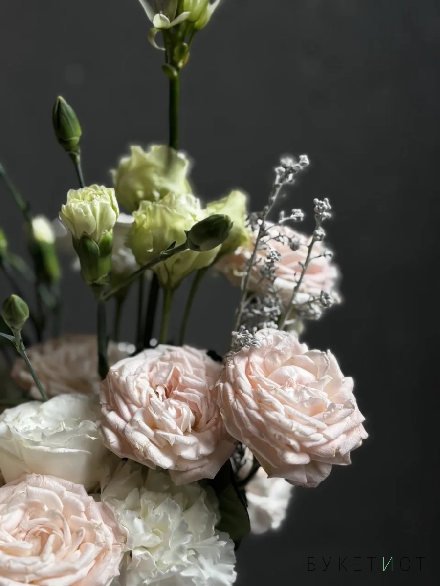 В составе: вывернутая роза сорта Бомбастик, роза сорта Плайя Бланка, эустома, лилия, орнитагалум, кохия.
