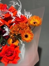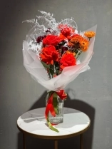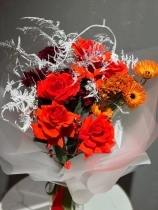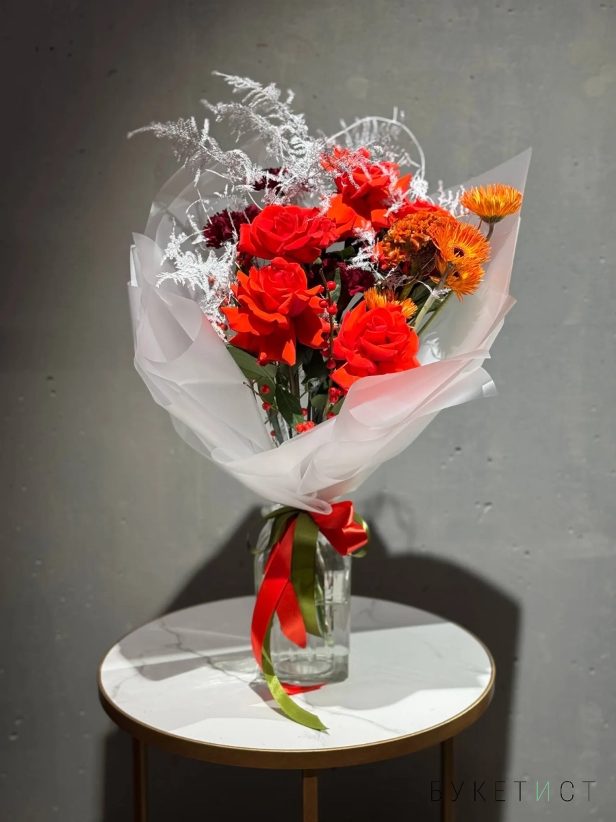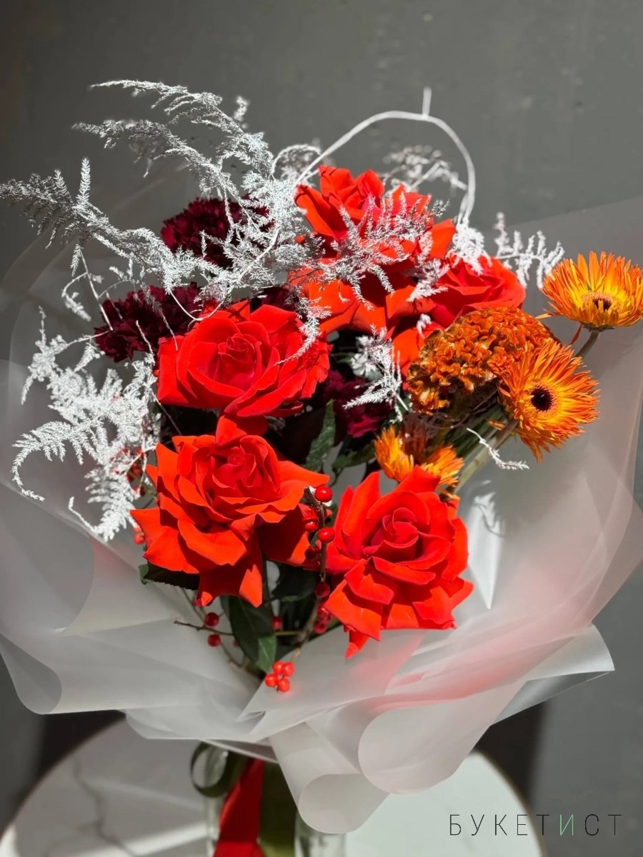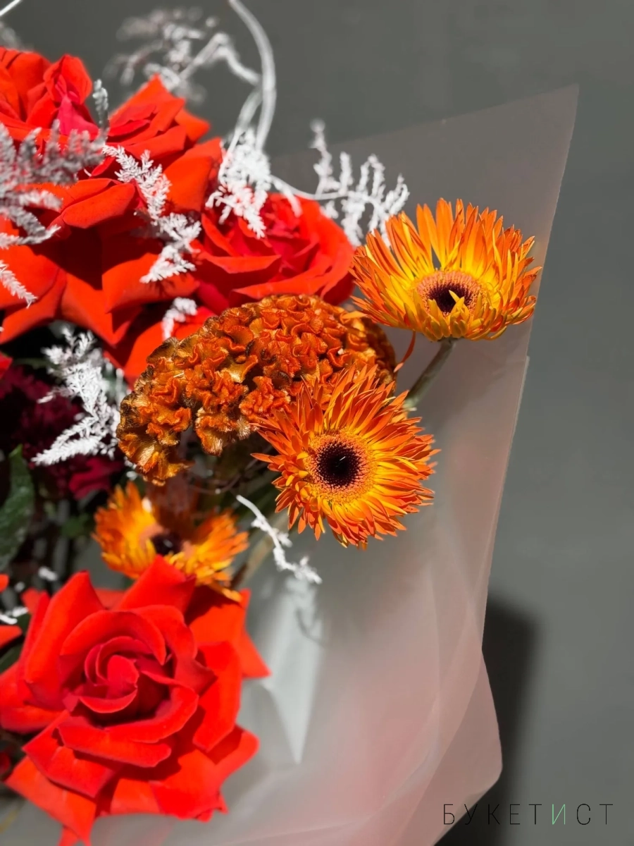 В составе: алые ажурные розы сорта Нина, стойкие бордовые диантусы, оранжевая гербера-ресничка, необычная целлозия и пушистый аспарагус.