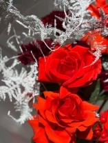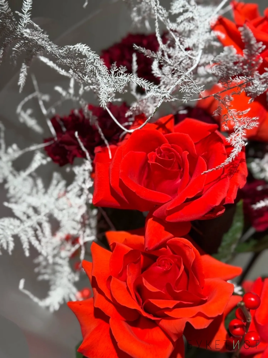 Зимний букет с ажурными розами сорта Нина и пушистым аспарагусом