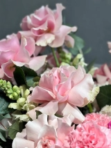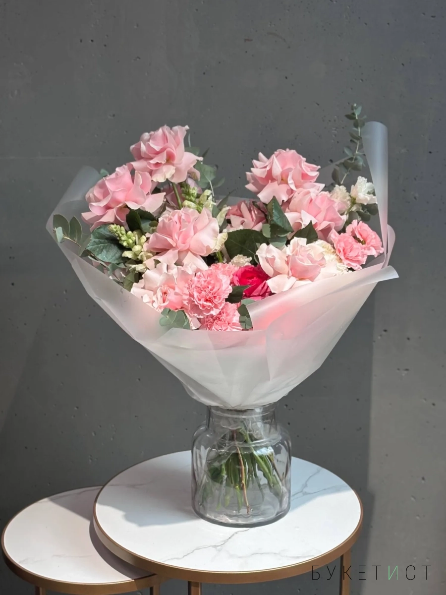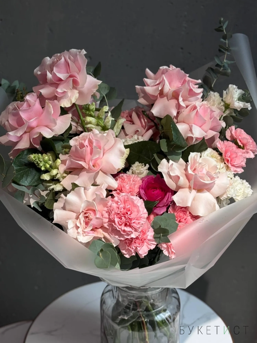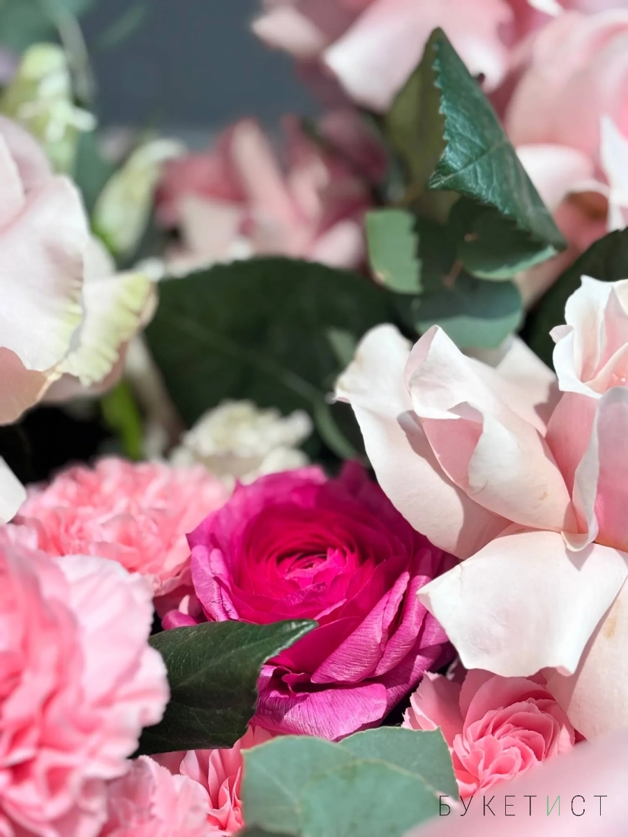 В составе: вывернутая роза сорта Пинк Мондиаль, гвоздики, ранункулюс, леувенбек и веточки эвкалипта.