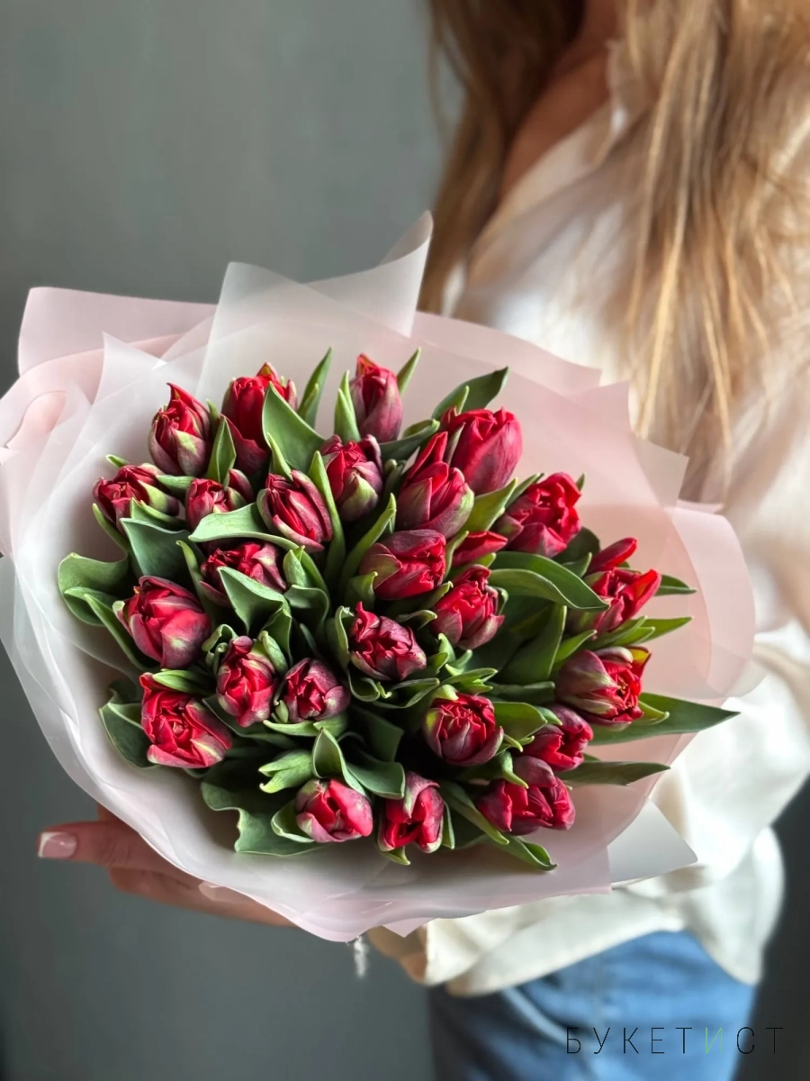 Букет пионовидных красных тюльпанов сорта Рэд Принцесс