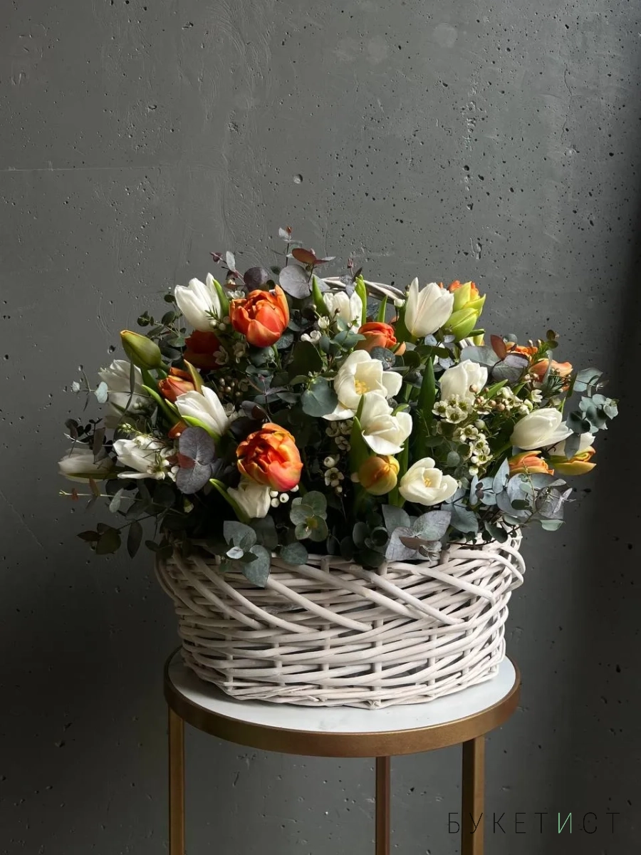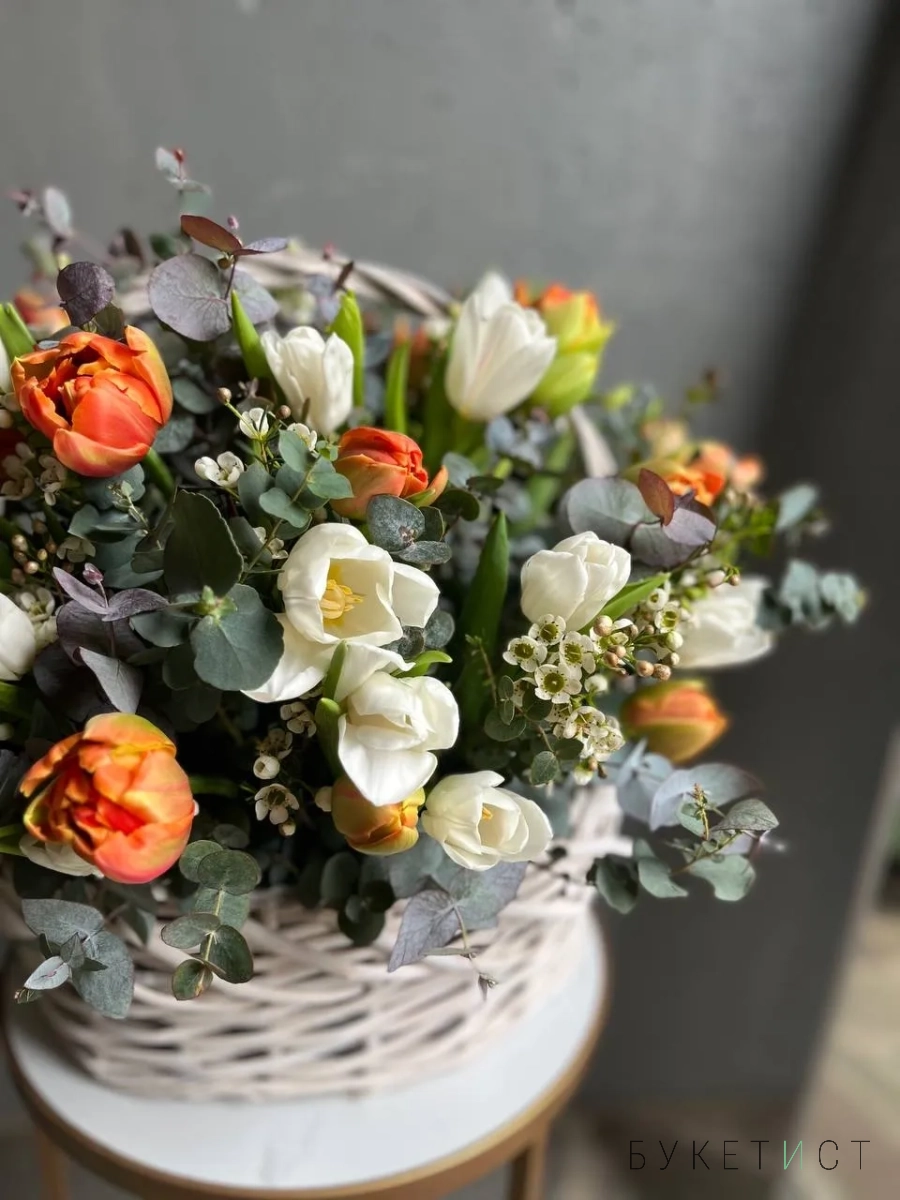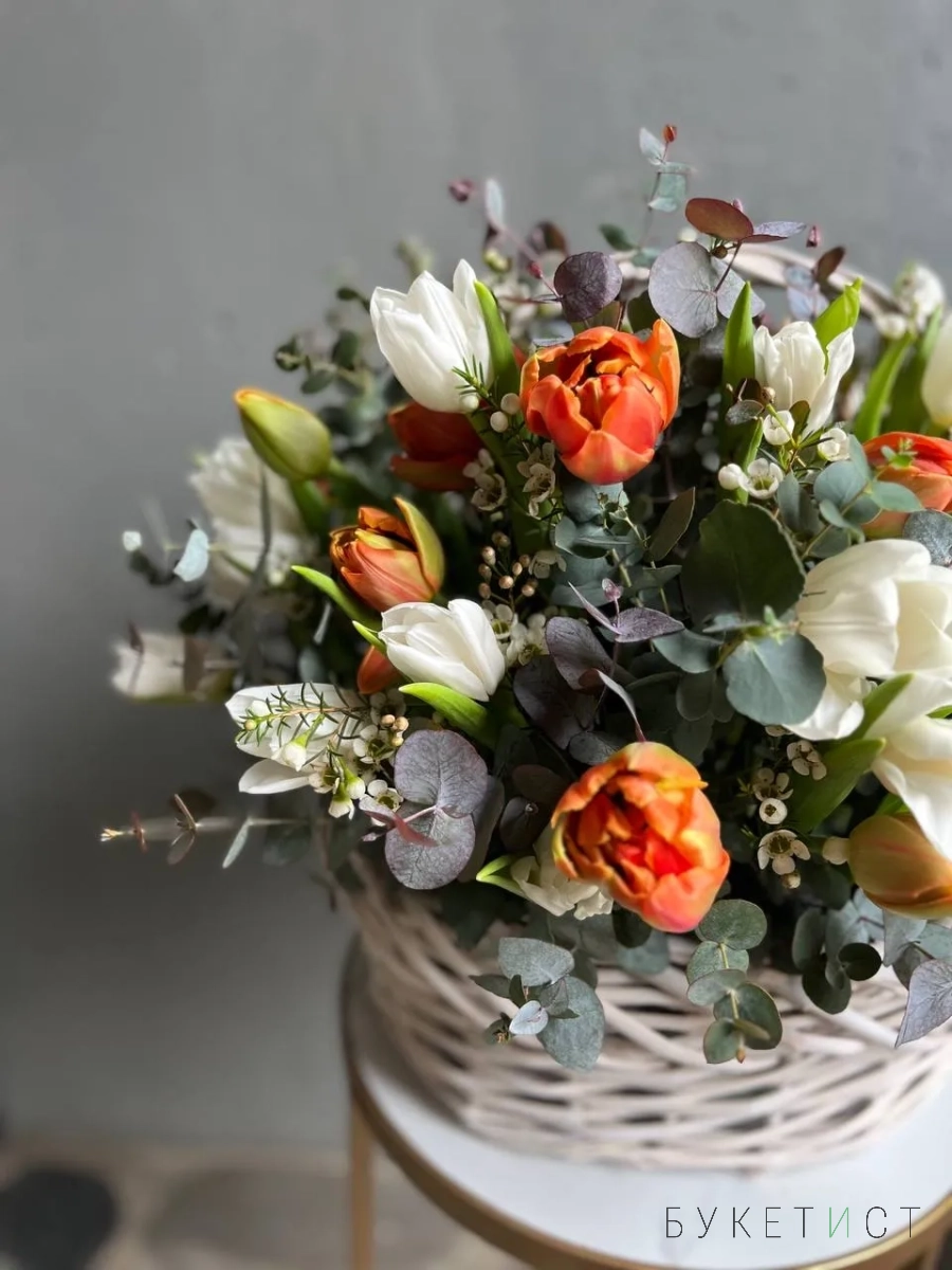 Ароматный букет пионовидных тюльпанов в корзине
