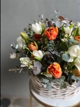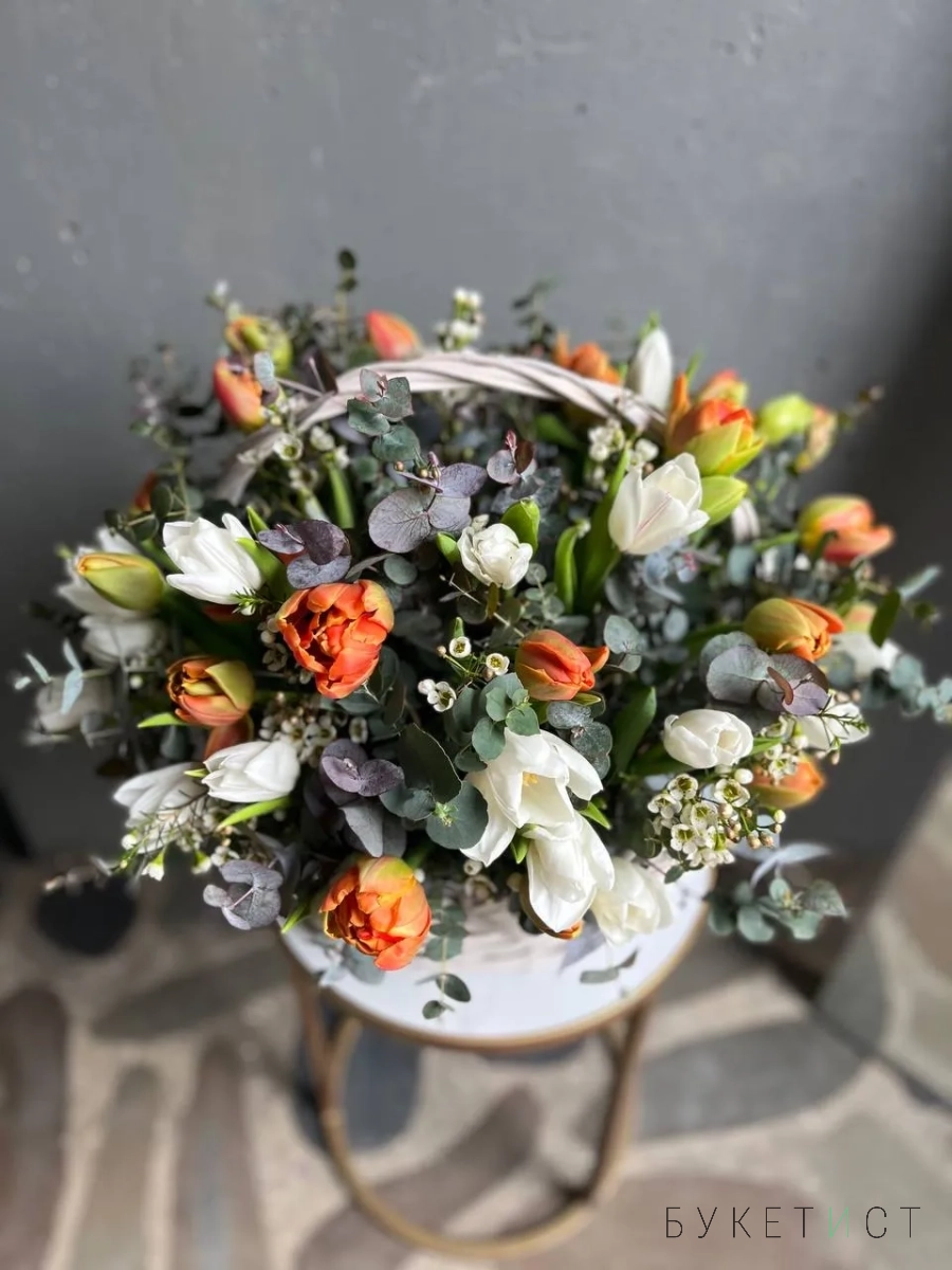 В составе: 49 стеблей двух сортов тюльпанов - Антарктика и пионовидных Оранж Принц, украшенные веточками шамелациума.