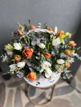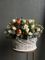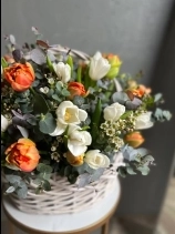Весенняя композиция в плетенной корзине. Цветы установлены в оазис (флористическая губка), требуют умеренного полива раз в два дня.