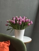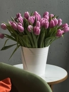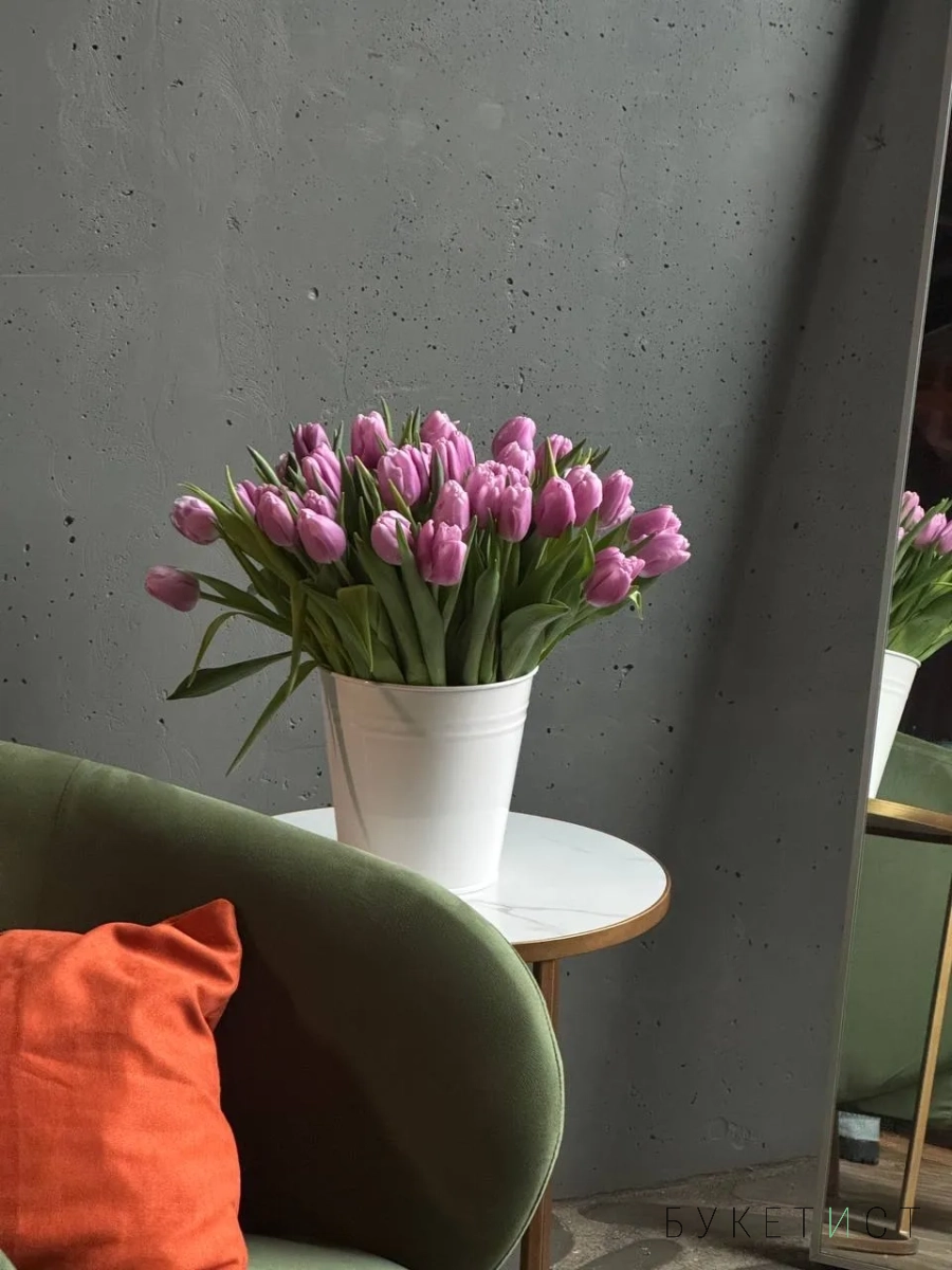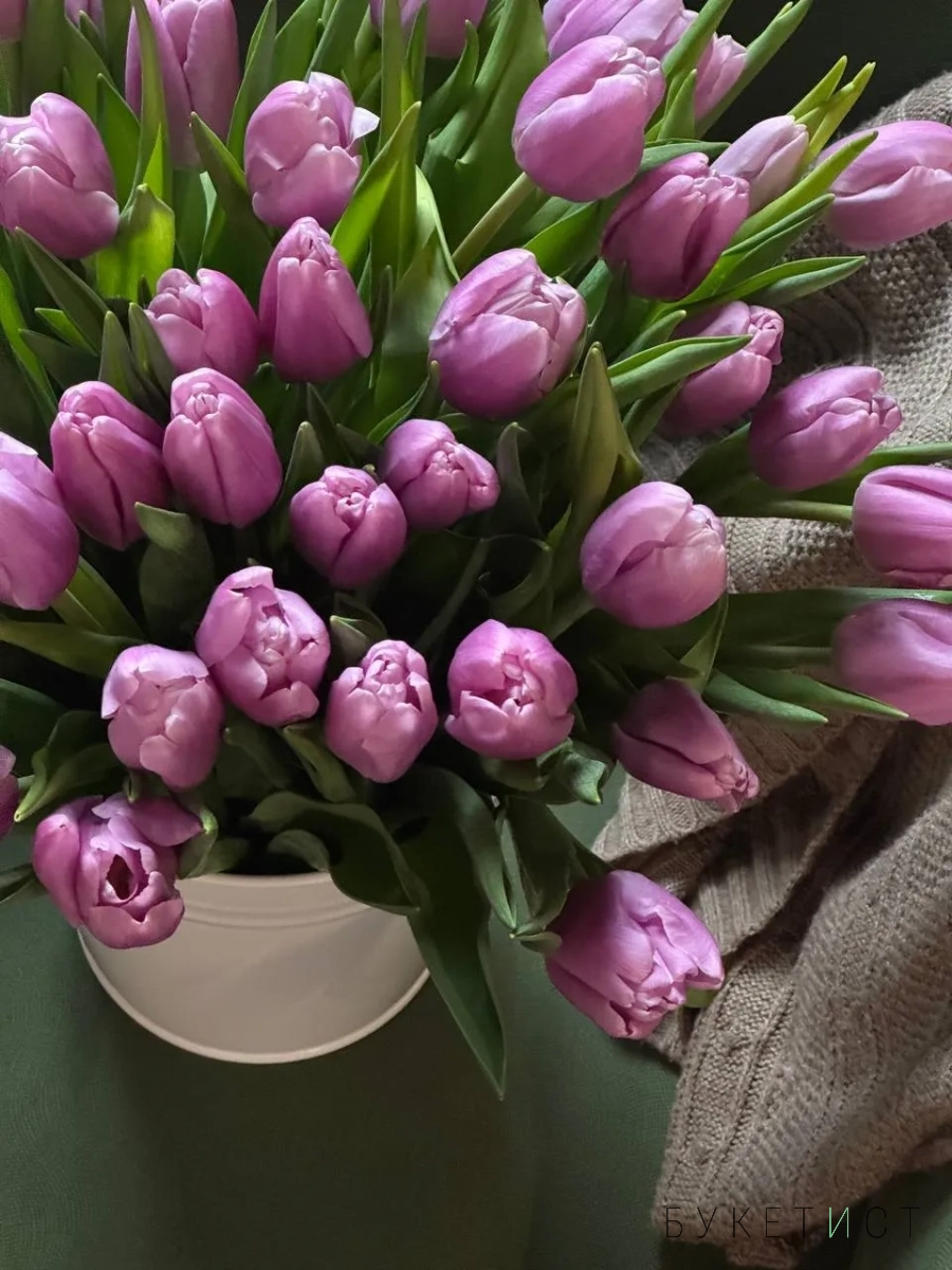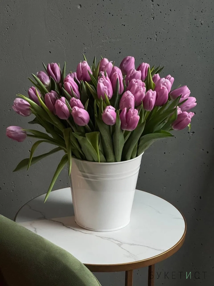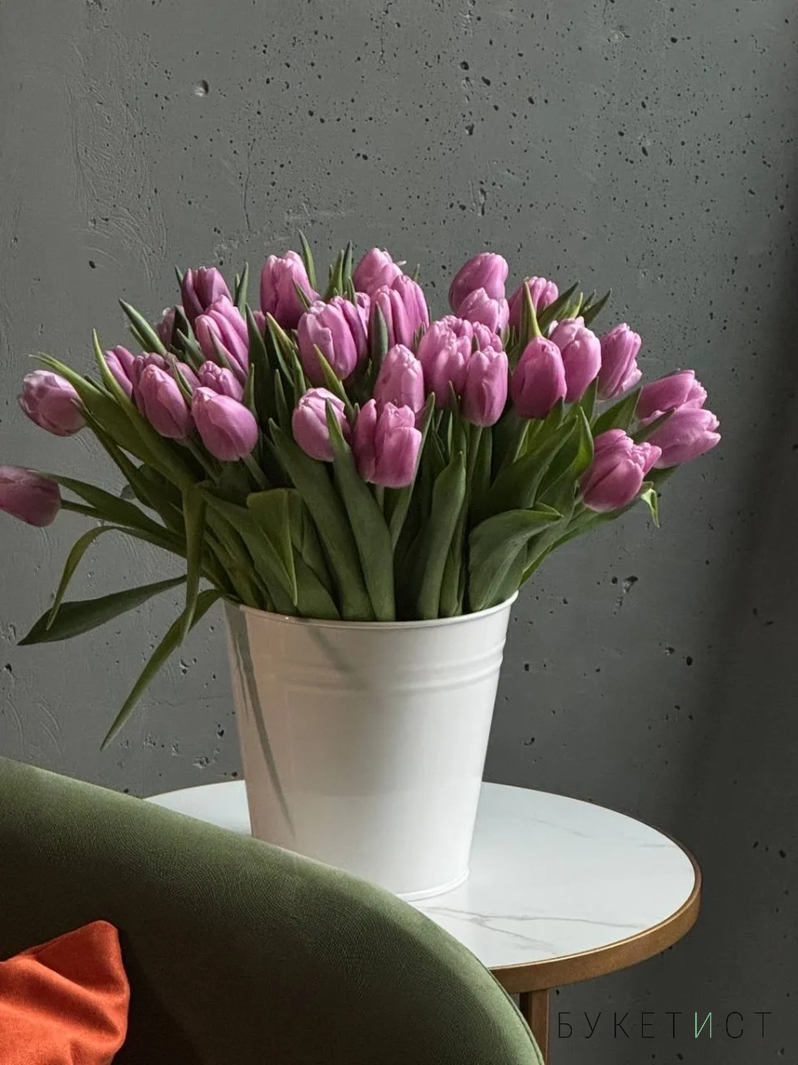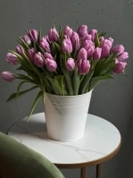 Охапка сиреневых тюльпанов в ведре