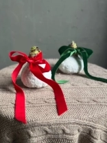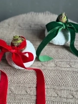 Живые ветви ароматной ели устанавливаются в специальный материал, пропитанный водой - это позволяет изделию держать форму и сохранять свежесть как можно дольше. Украшения аккуратно крепим на специальный клей (не обходится и без особой флористической магии, конечно).