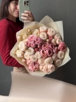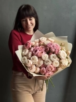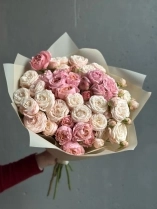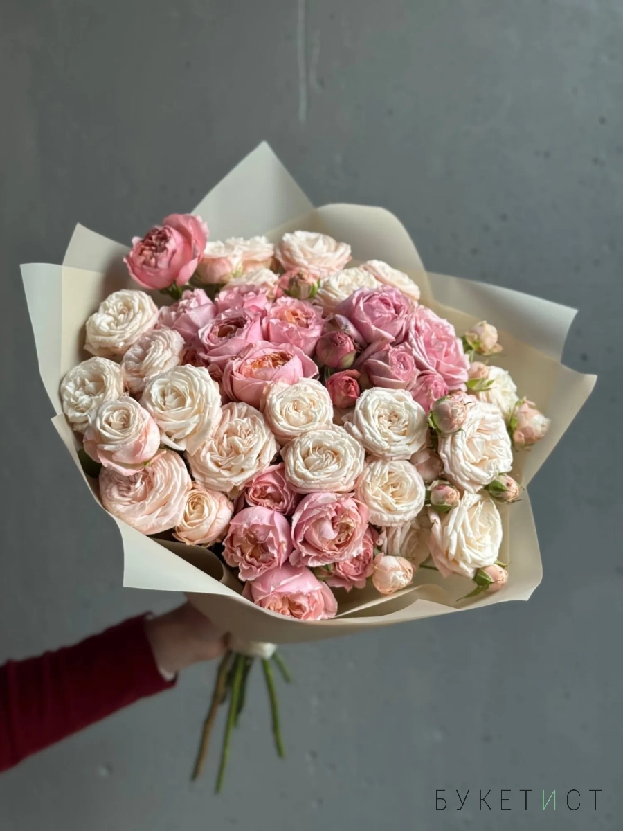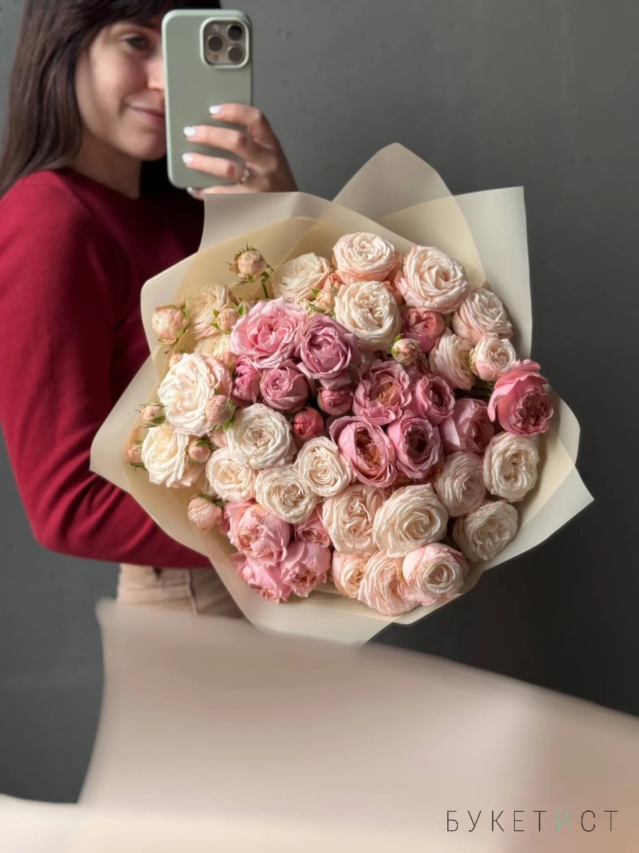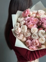 Монобукет из двух сортов пионовидной розы - персиковой Джульетты и кремового Бомбастика. На каждом кустовом стебле пионовидной розы — 2–3 бутона, поэтому цветов визуально гораздо больше, чем стеблей. На фото представлен букет из 15 стеблей. Прелесть, не правда ли?