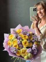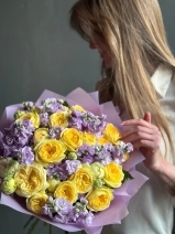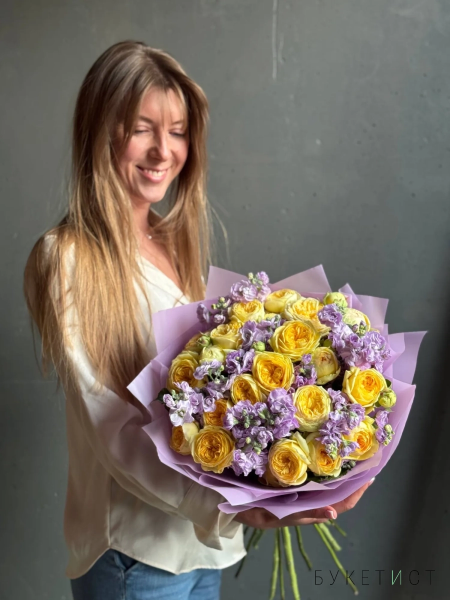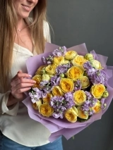 В составе букета пионовидные кустовые розы Пиони бабблз и ароматной маттиолы.
