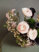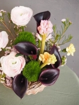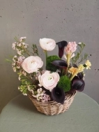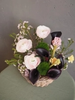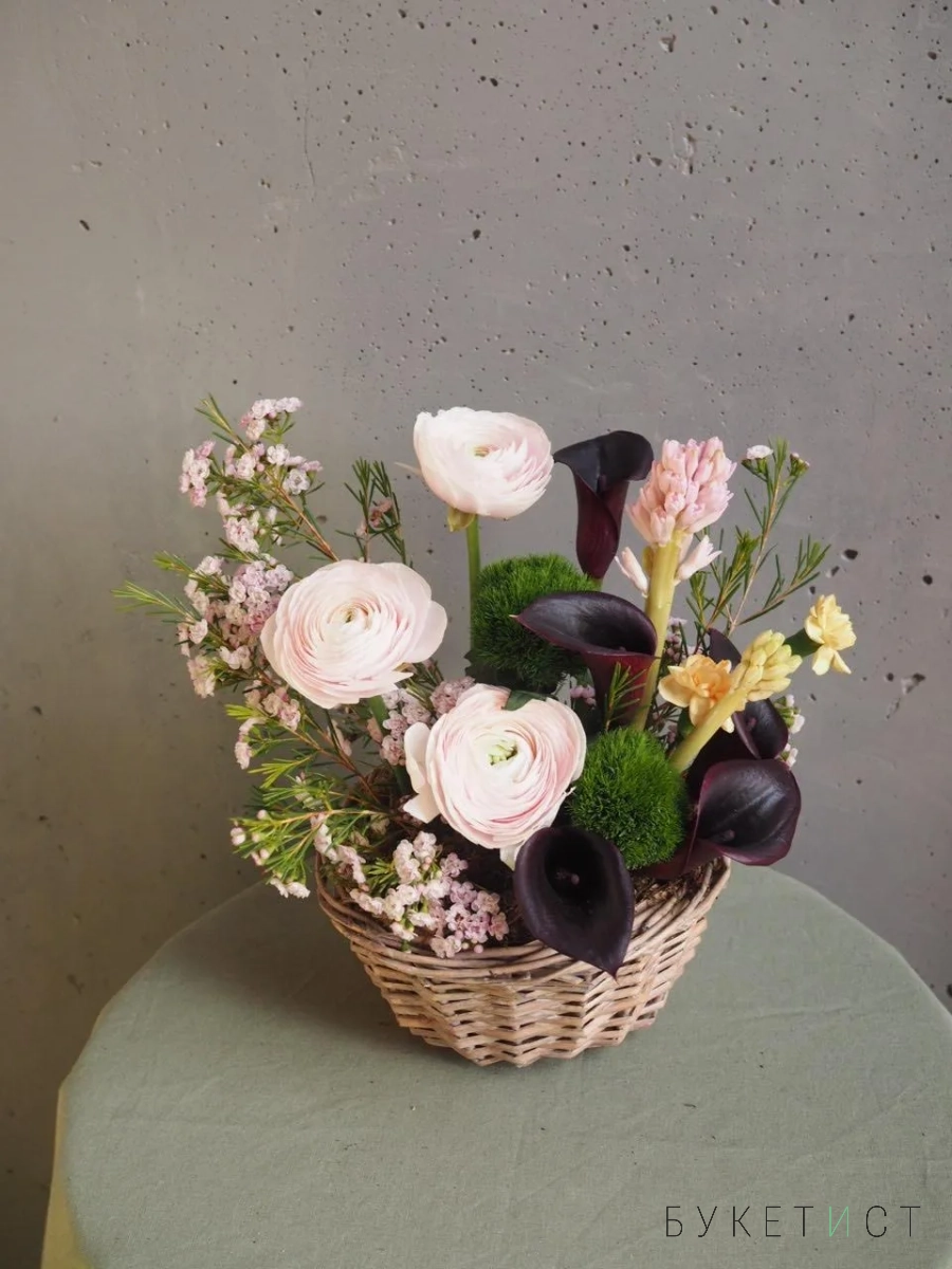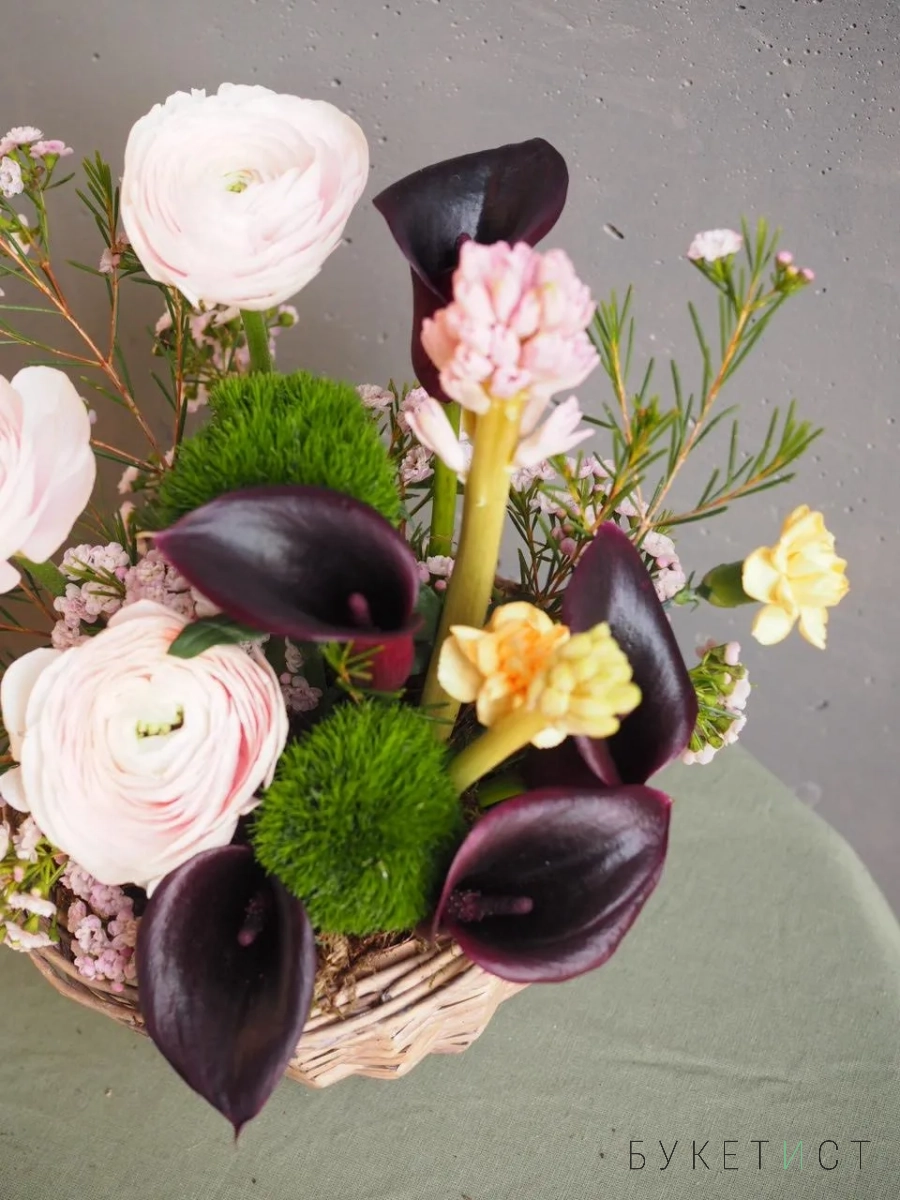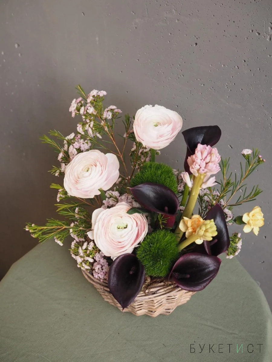 Композиция сочетает в себе веточки хамелациума, стойкие диантусы, ранункулюсы и элегантные каллы.