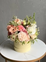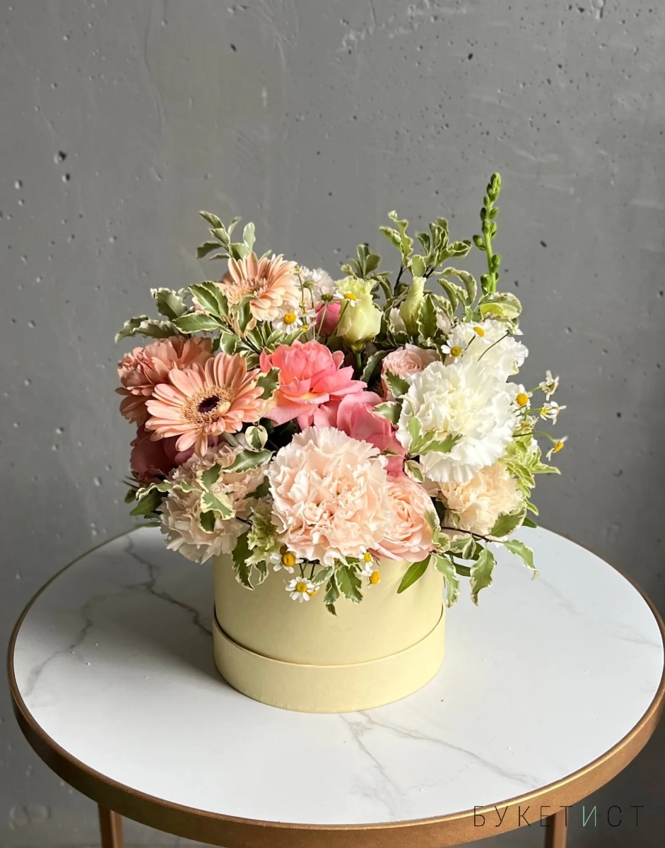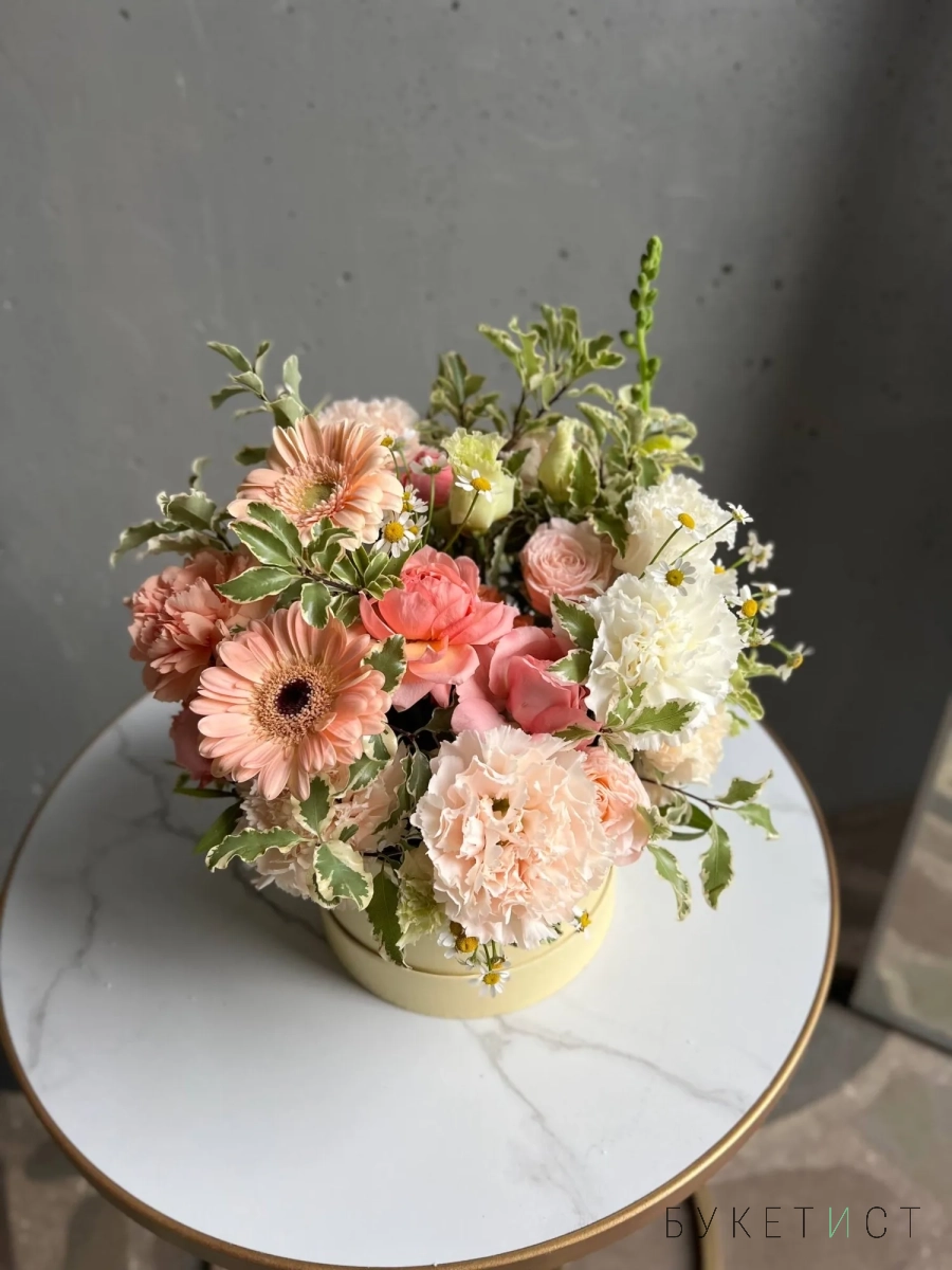 Шляпная коробка является частью композиции и продается вместе с цветами.
