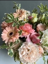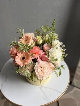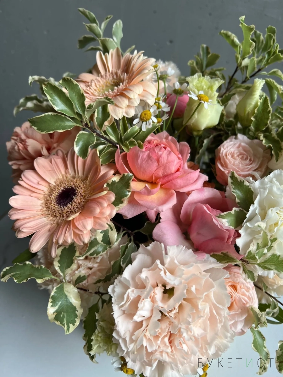 Состав композиции: кремовые диантусы, герберы, кустовые розы сорта Джульетта, танацетум, питоспорум.