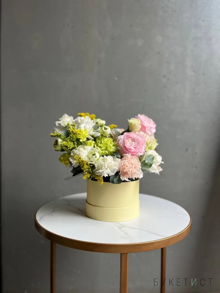 Композиция в шляпной коробке лимонного оттенка. Цветы установлены в оазис (флористическая губка), требуют умеренного полива каждый день.