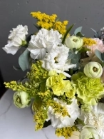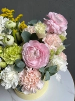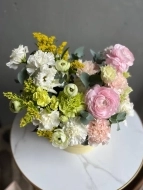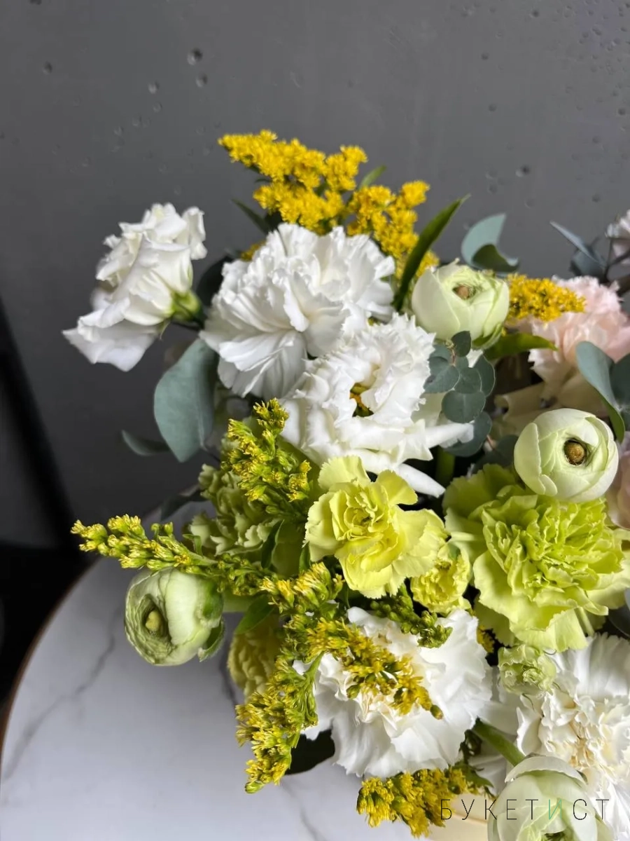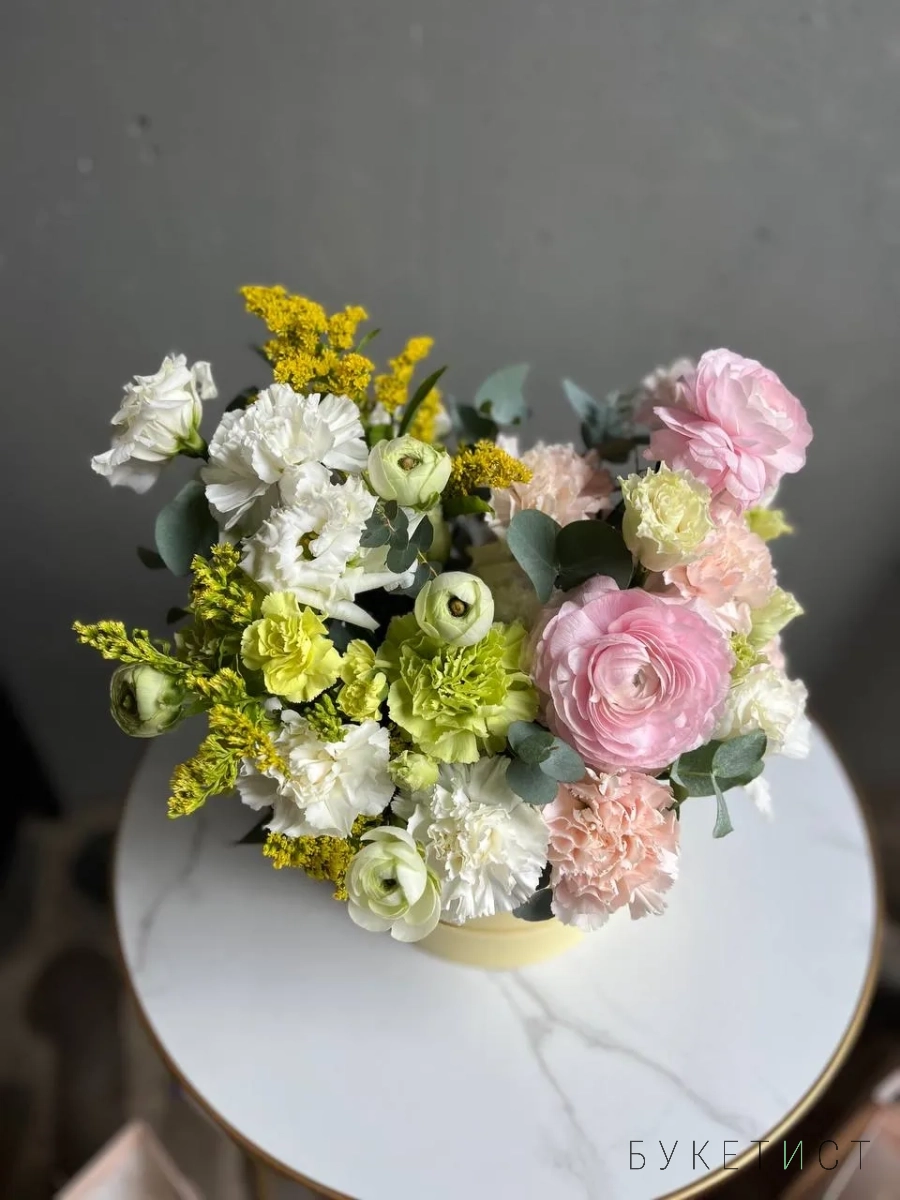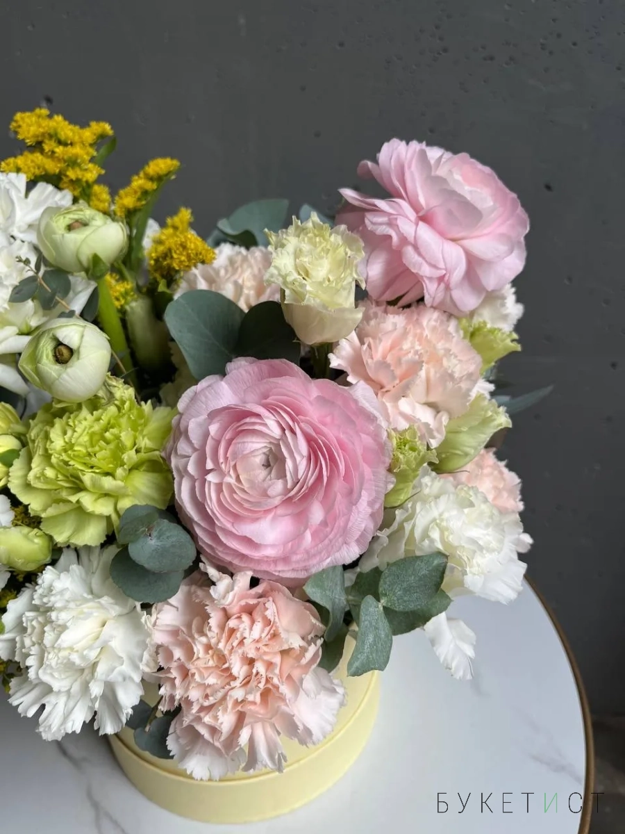 Состав композиции: сезонные ранункулюсы сорта Леди, стойкие диантусы трех сортов, кружевная эустома, лимонная солидаго и веточки эвкалипта.