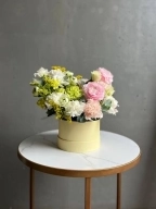 Шляпная коробка является частью композиции и продается вместе с цветами.