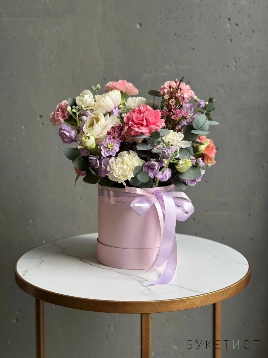 Шляпная коробка является частью композиции и продается вместе с цветами.