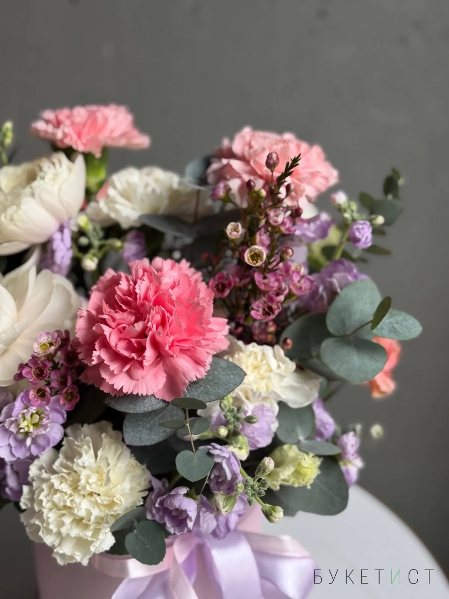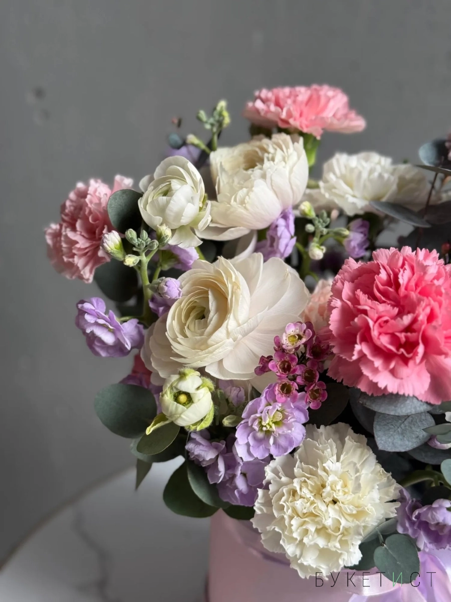Состав композиции: сезонные ранункулюсы сорта Ханой, диантусы двух сортов, ароматная маттиола, соцветия хамелациума и веточки эвкалипта.