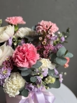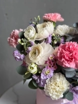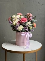 Композиция в шляпной коробке нежно-розового оттенка. Цветы установлены в оазис (флористическая губка), требуют умеренного полива каждый день.