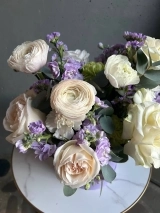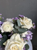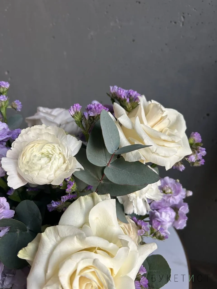 Состав композиции: Ранункулюсы в нежном оттенке, ароматная маттиола, стица, одноголовые диантусы двух оттенков, одноголовые розы сорта Вайт Охара и Мондиаль и веточки эвкалипта.