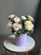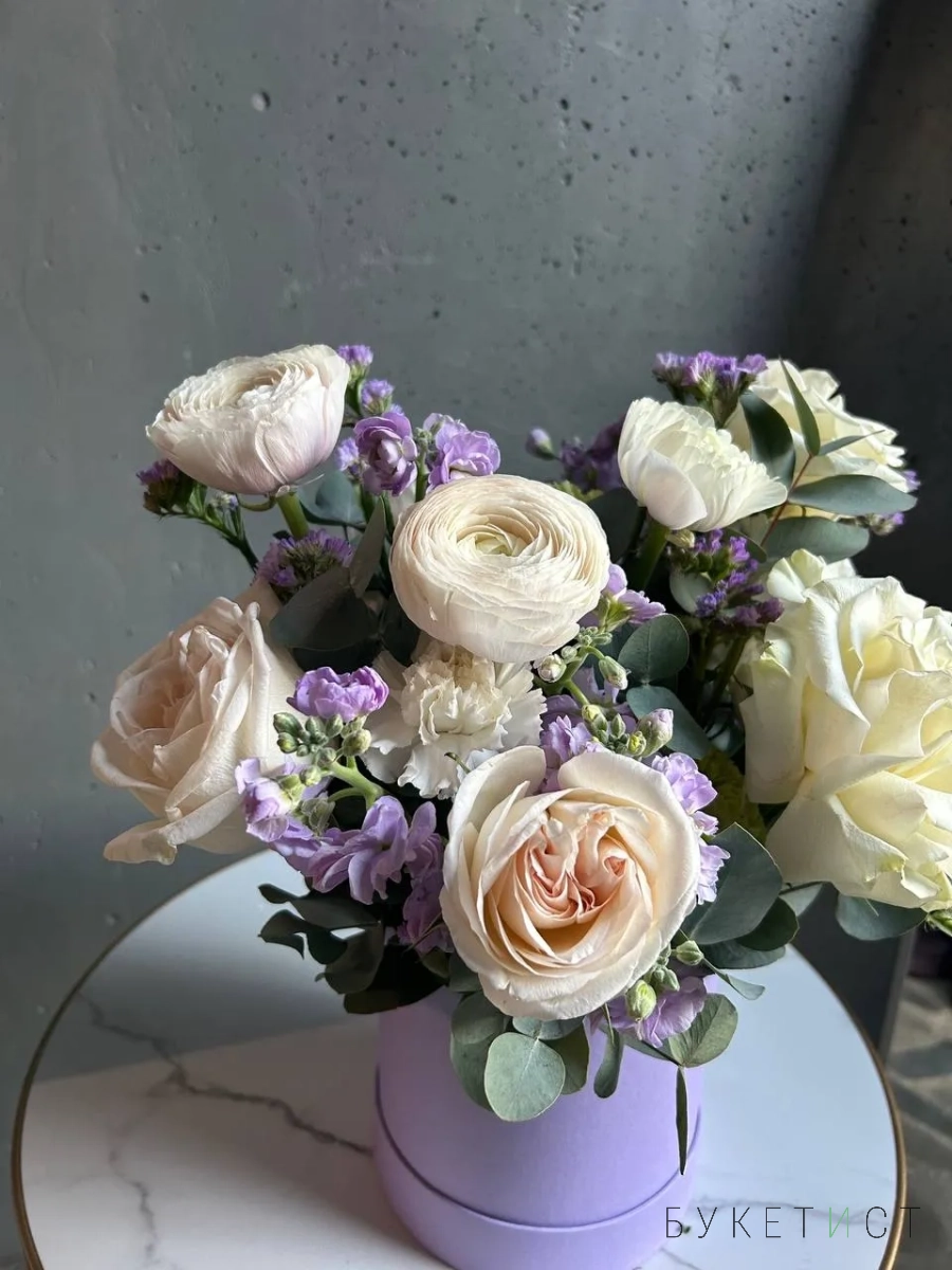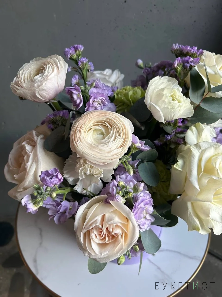 Шляпная коробка является частью композиции и продается вместе с цветами.