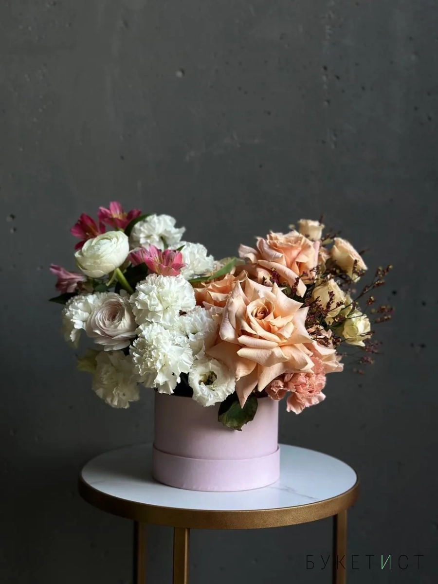 Композиция в шляпной коробке в нежном оттенке. Цветы установлены в оазис (флористическая губка), требуют умеренного полива каждый день.