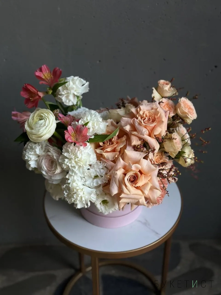 Шляпная коробка является частью композиции и продается вместе с цветами.