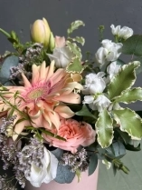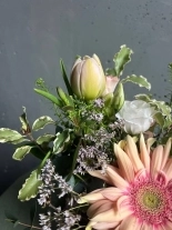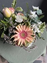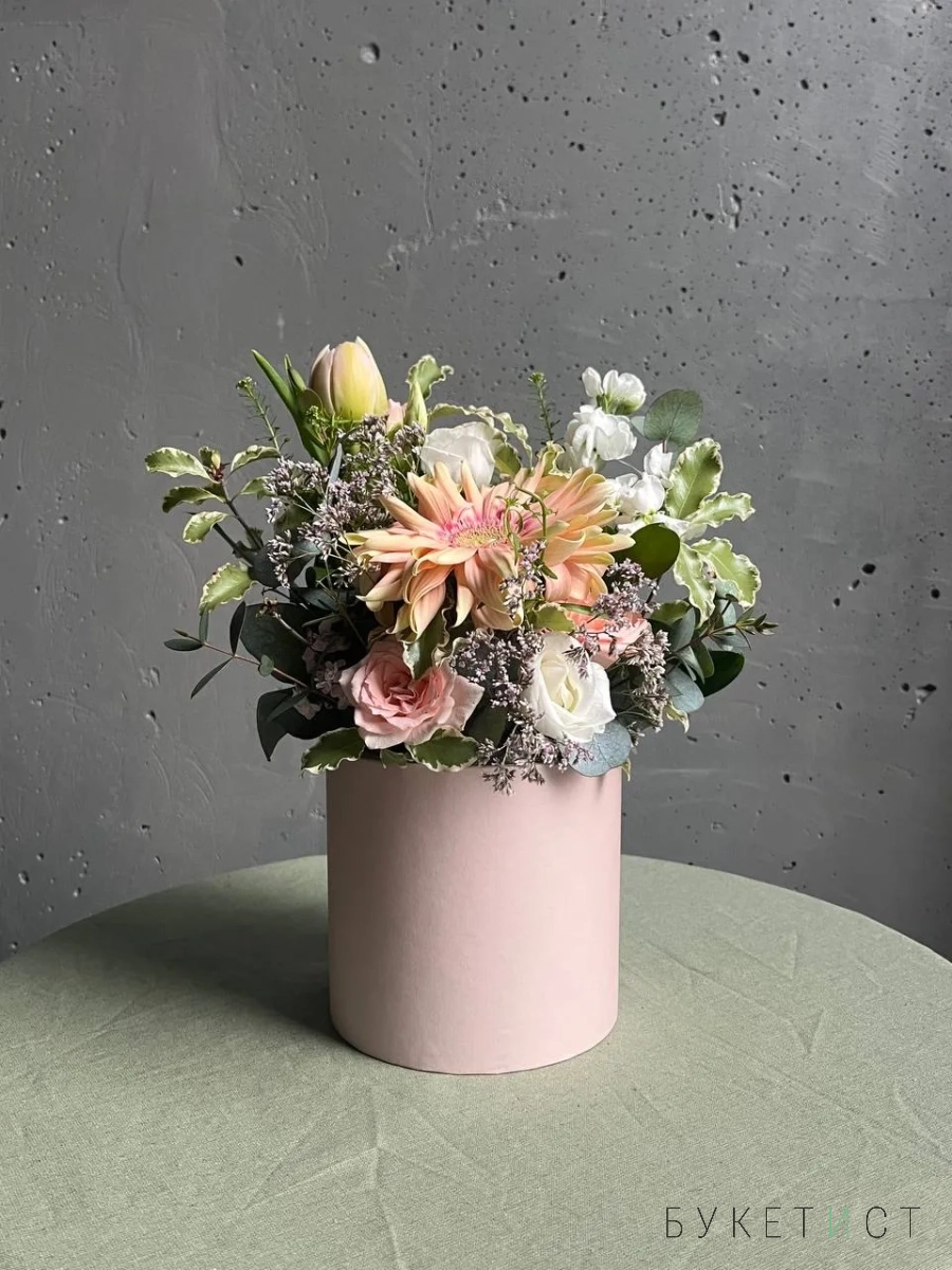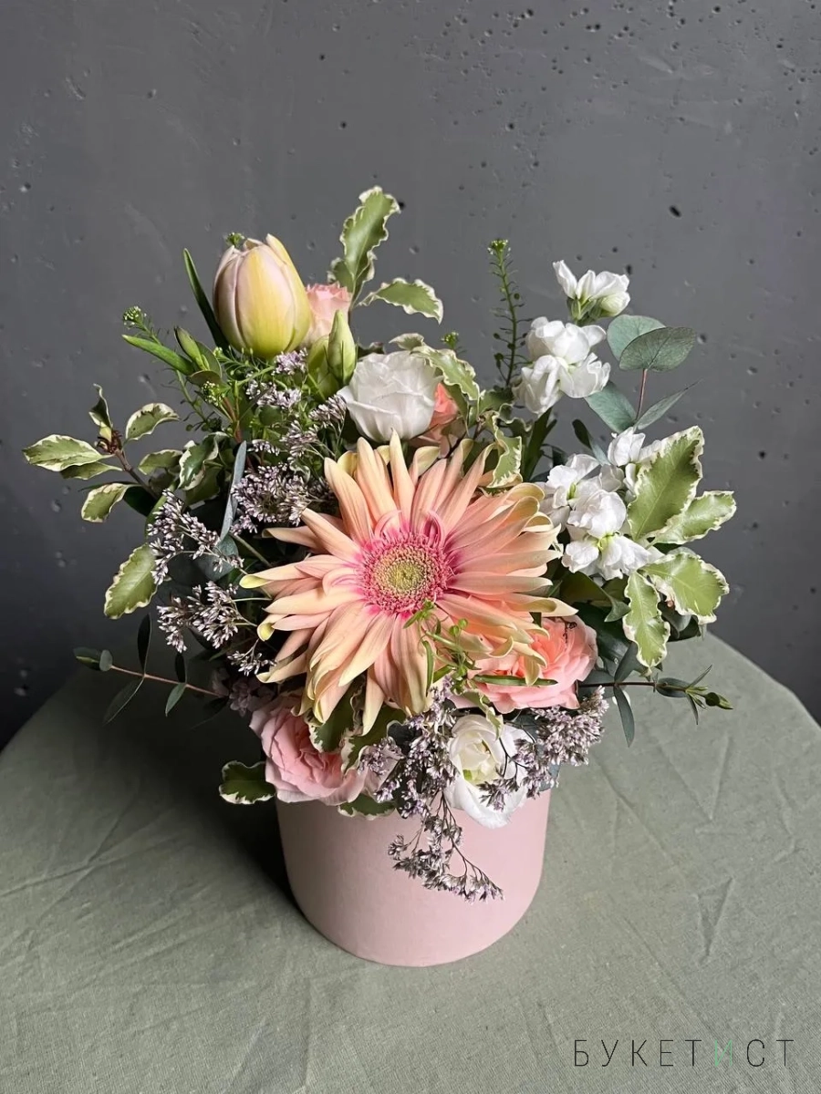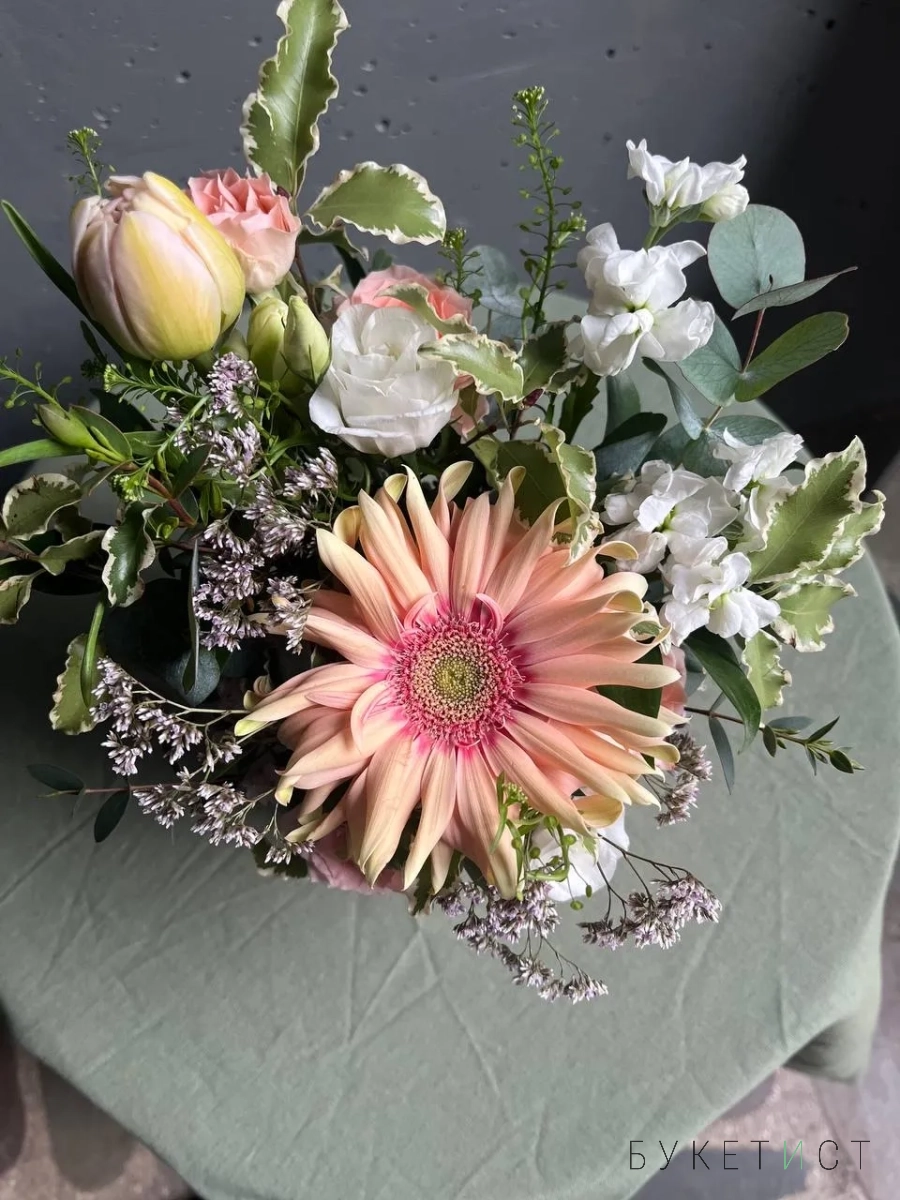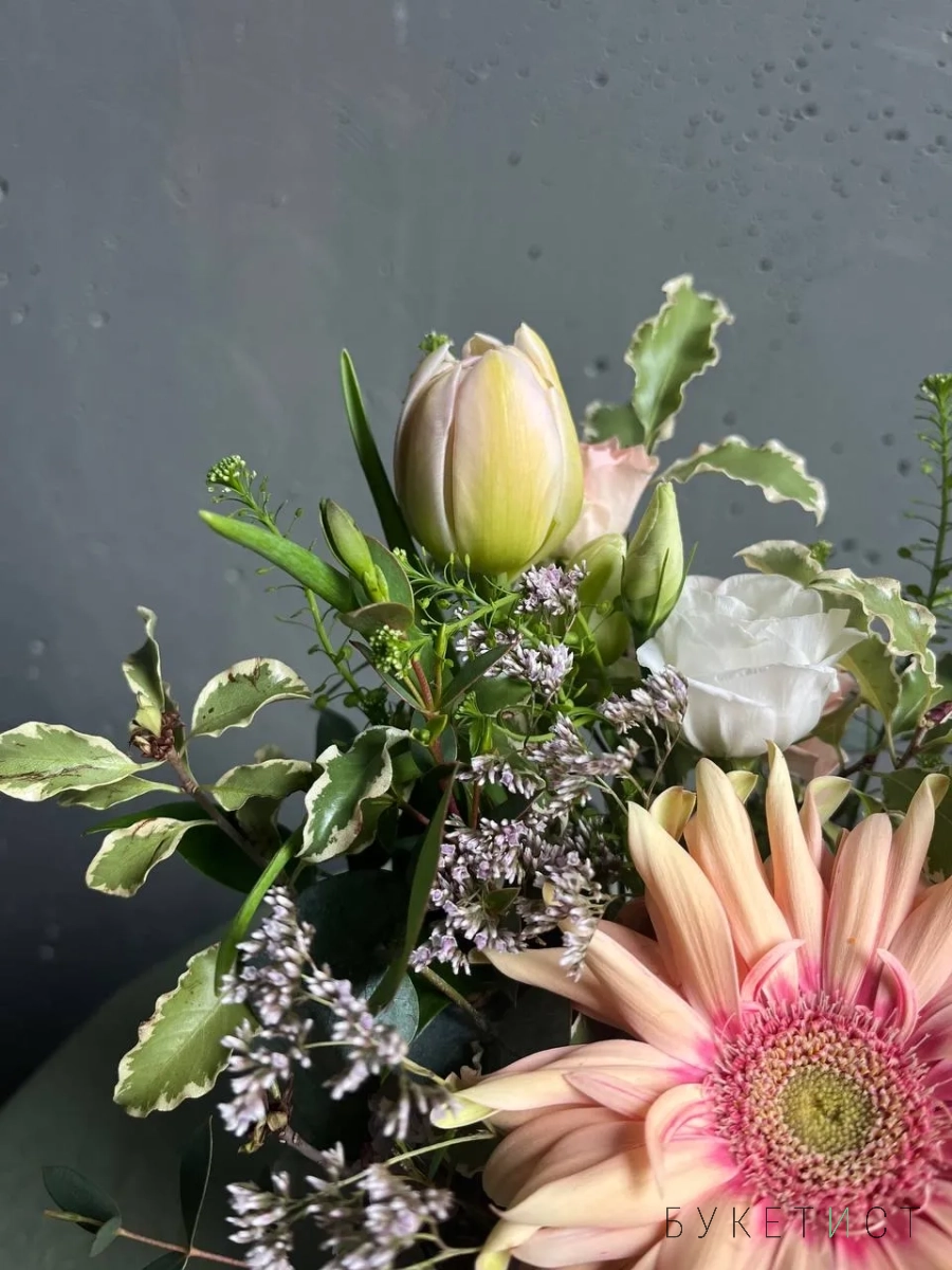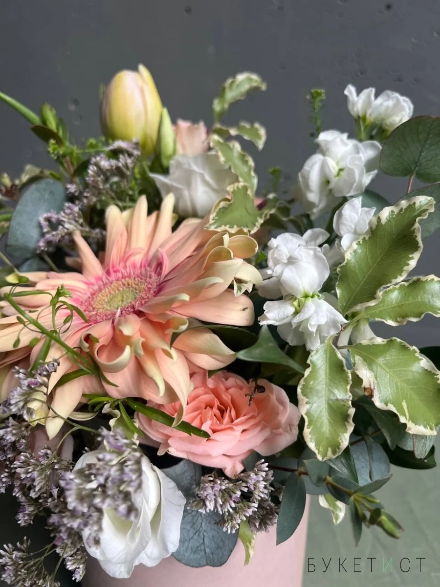 В составе: кустовая эустома, пионовидный тюльпан, гербера, кустовая роза, питтоспорум, веточки эвкалипта и лимониума в лавандовом оттенке.