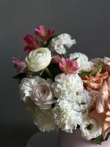 Состав композиции: Ажурные розы сорта Эрмоса, белые диантусы, ранункулюсы в нежном оттенке, малиновая альстромерия, кустовая роза и веточки лимониума.