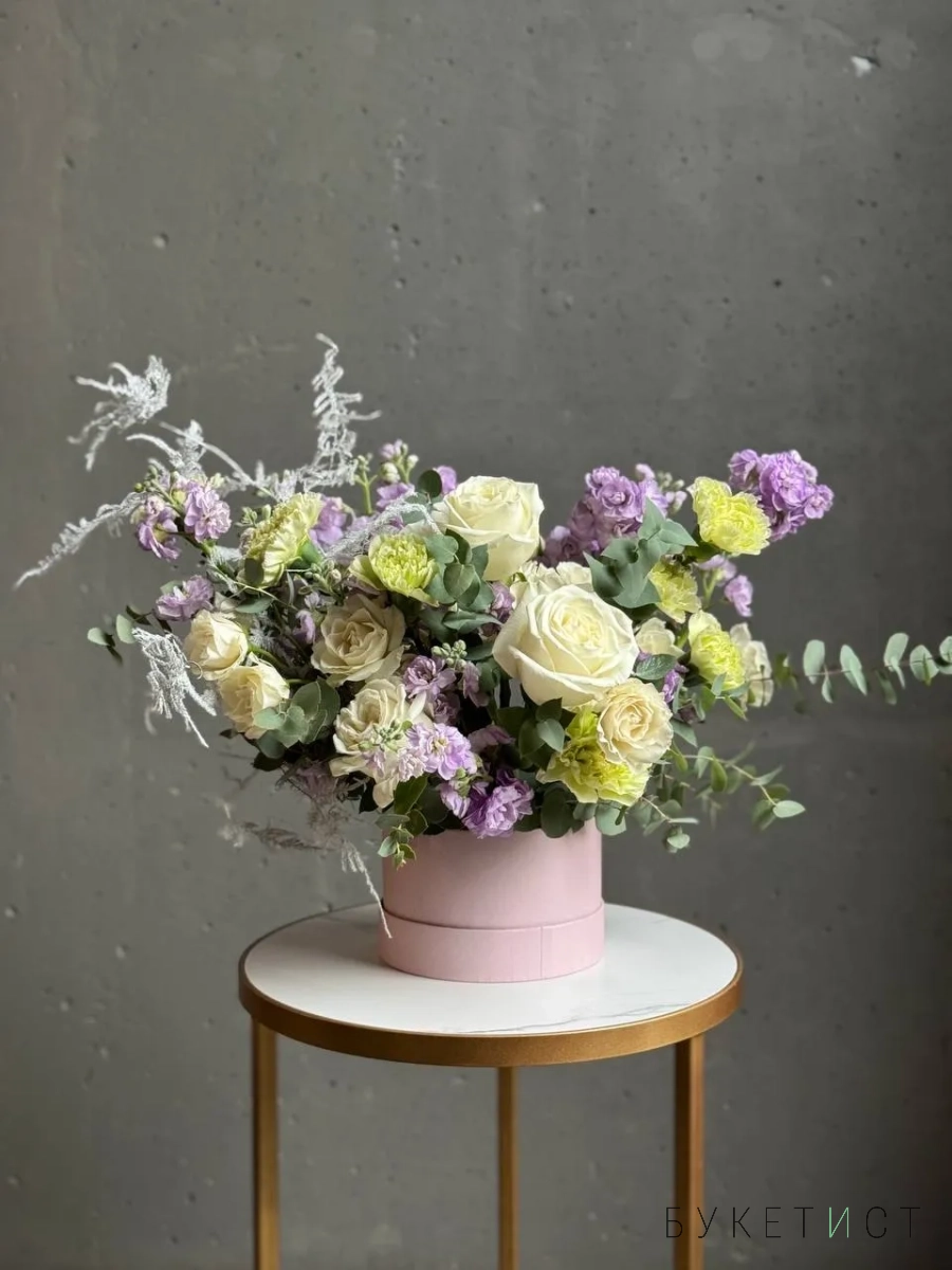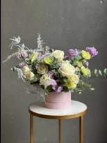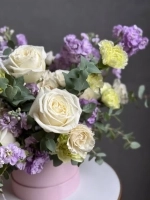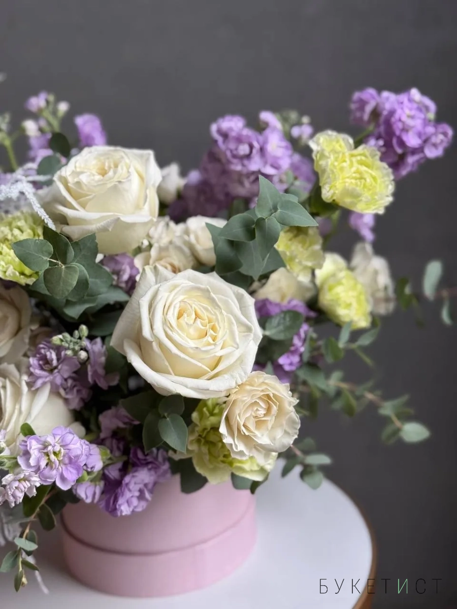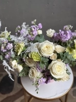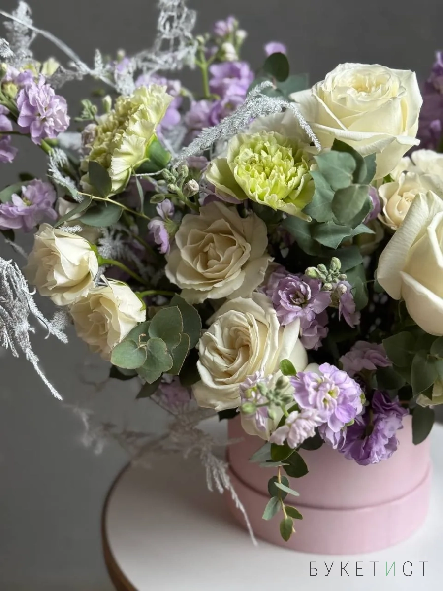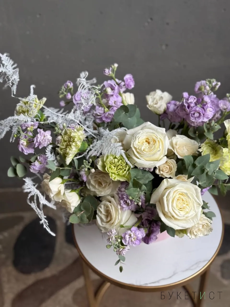 В составе: белые розы сорта Плайя Бланка, лавандовая маттиола, гвоздики, аспарагус, эвкалипт.