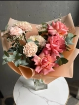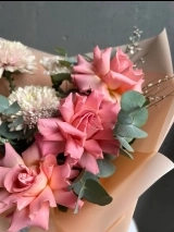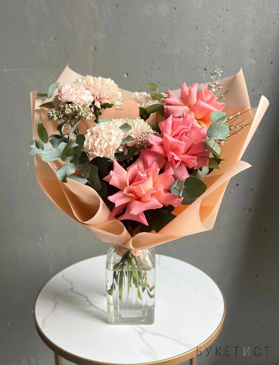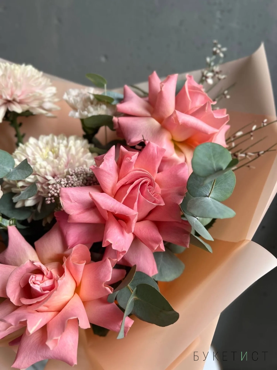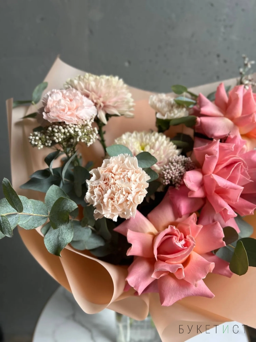В составе букета: персиковая вывернутая роза сорта Эрмоса, кремовые диантусы, хризантема, ароматная гениста, и веточки эвкалипта.