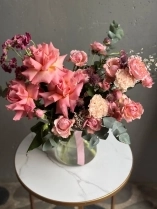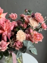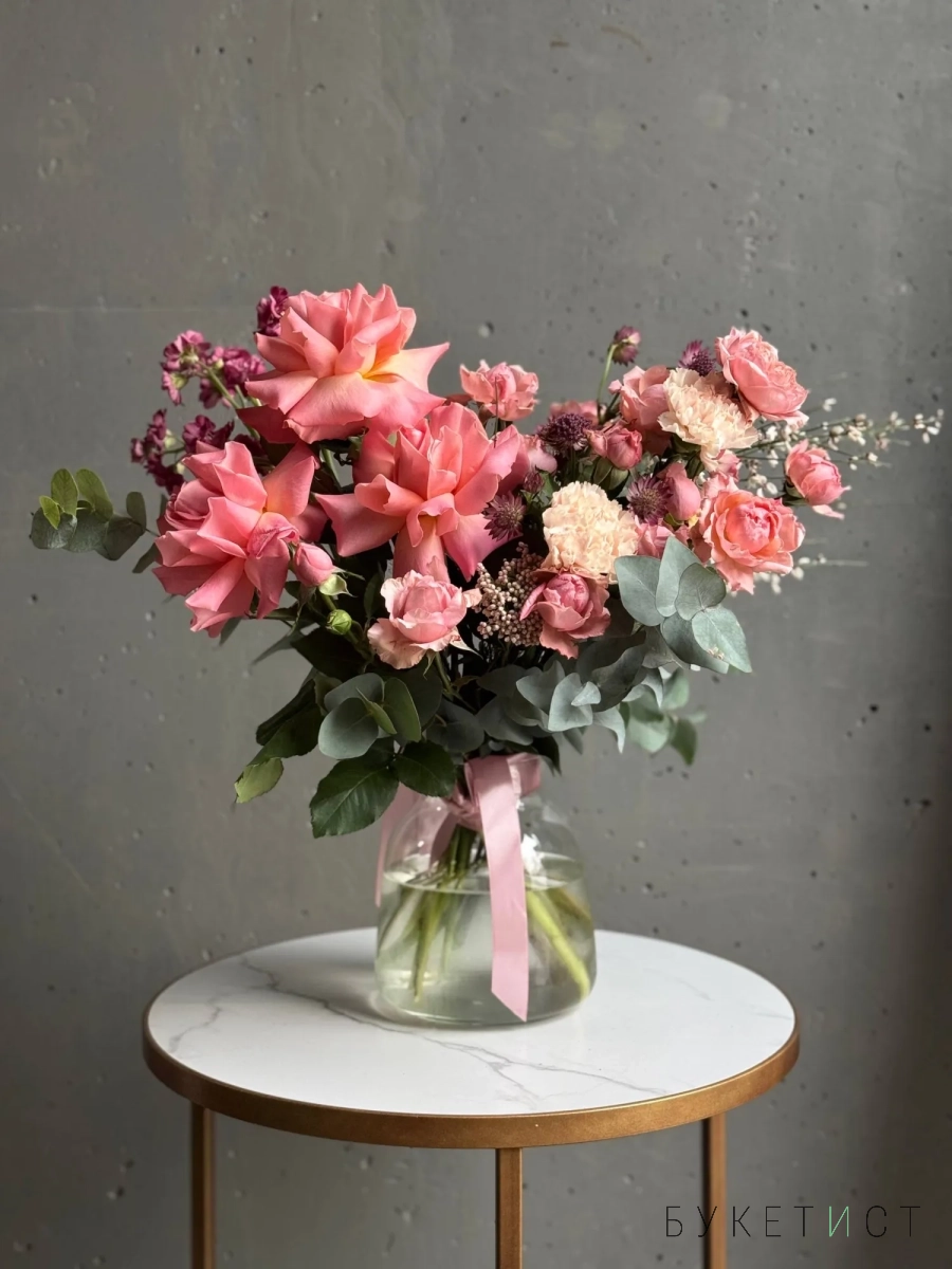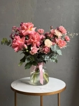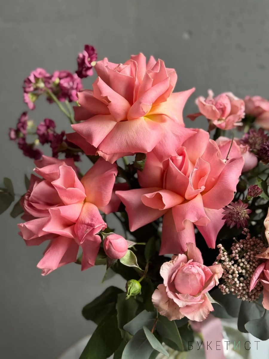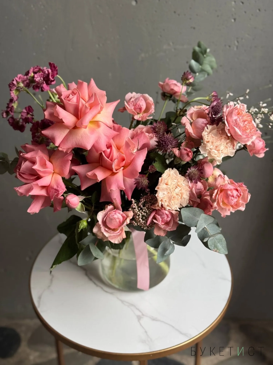 В составе букета: ажурная роза сорта Шиммер, персиковая пионовидная роза сорту Джульетта, необычная астранция, ароматная маттиола, веточки эвкалипта, весенние веточки генисты и соцветия озотамнуса.