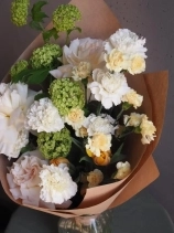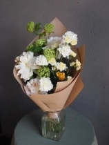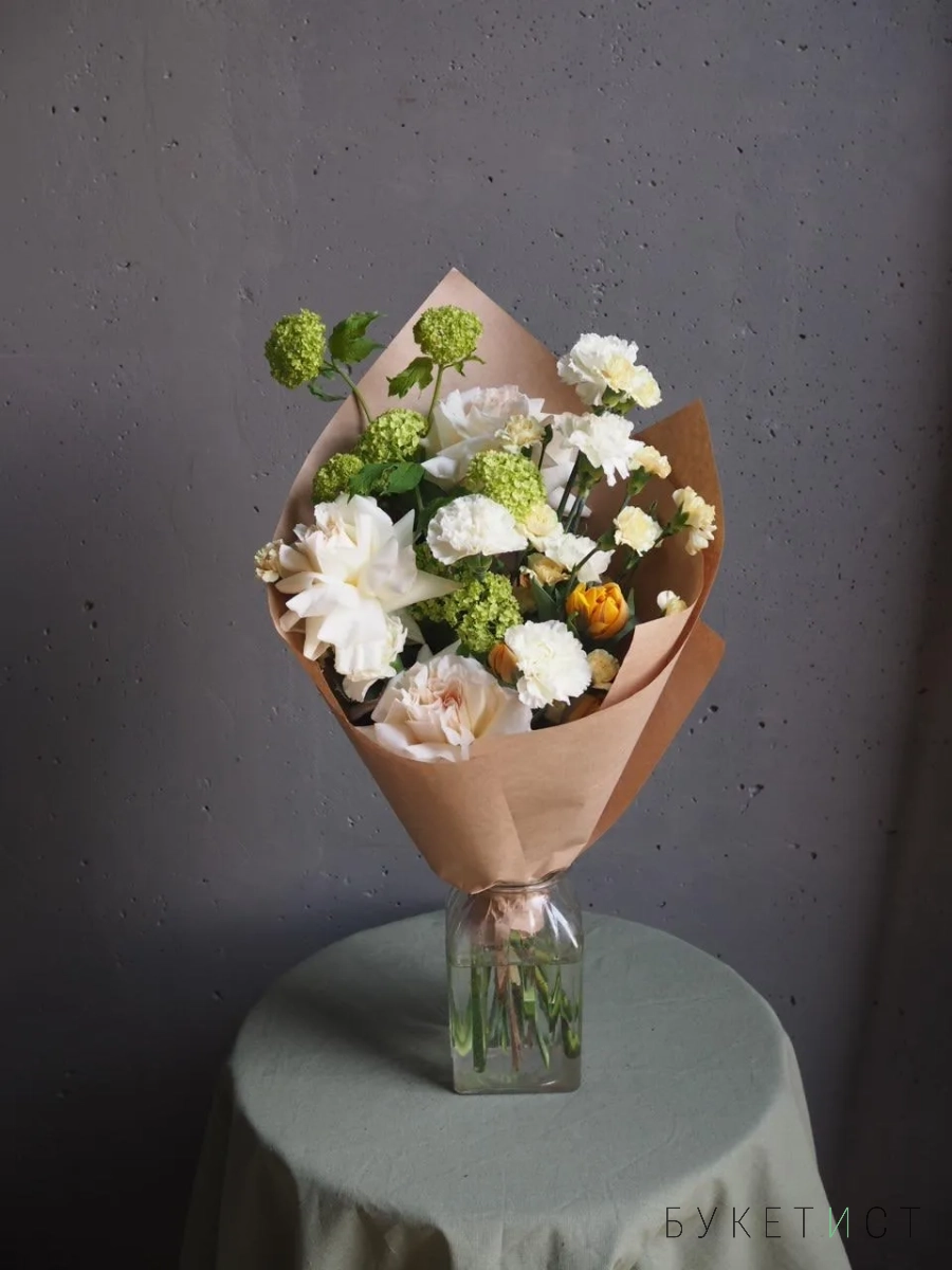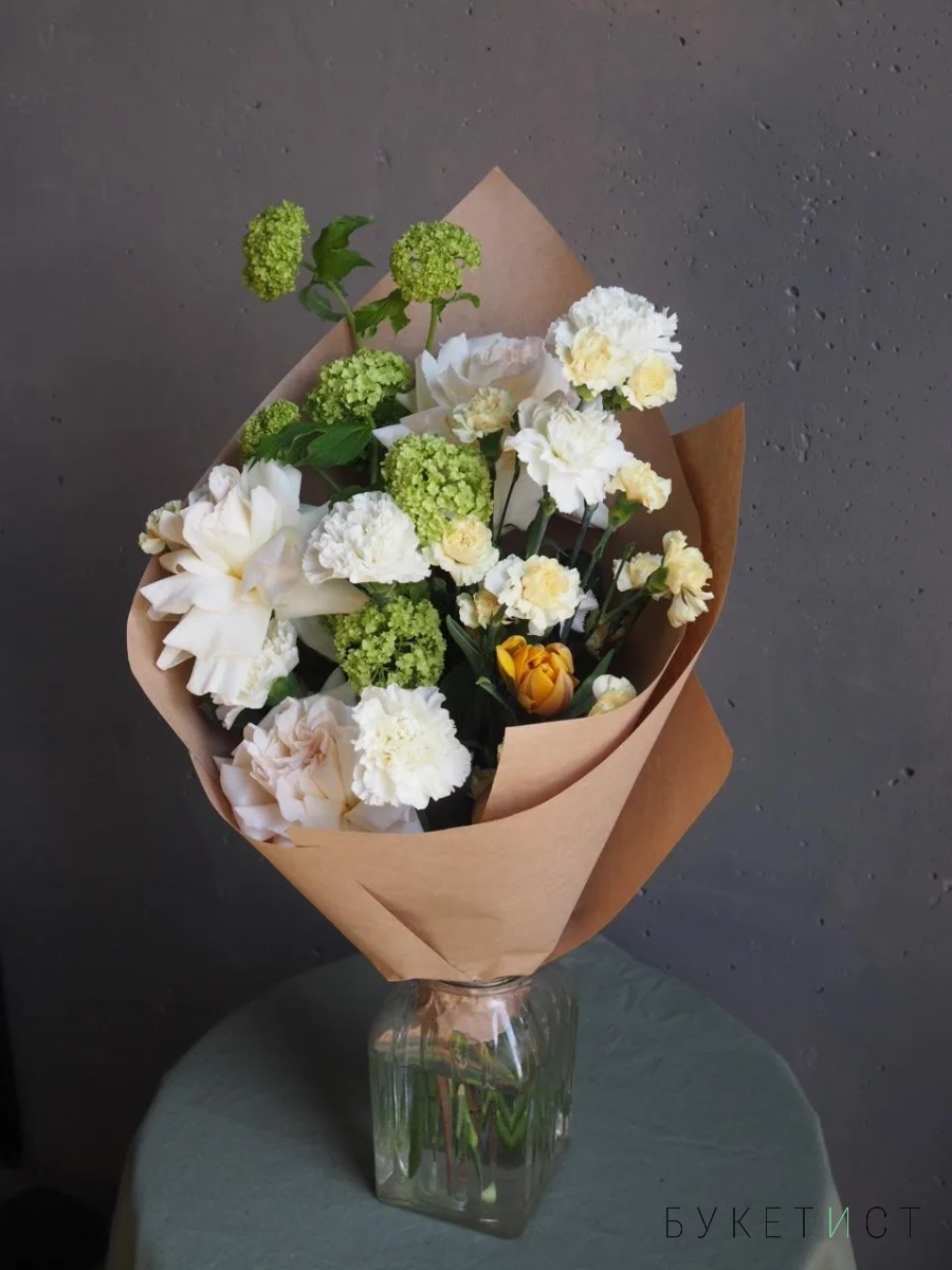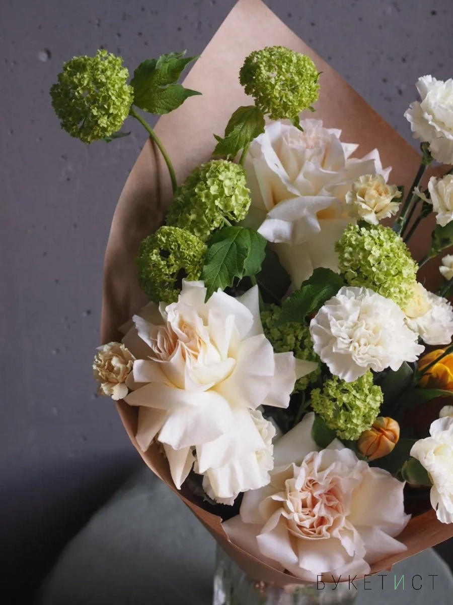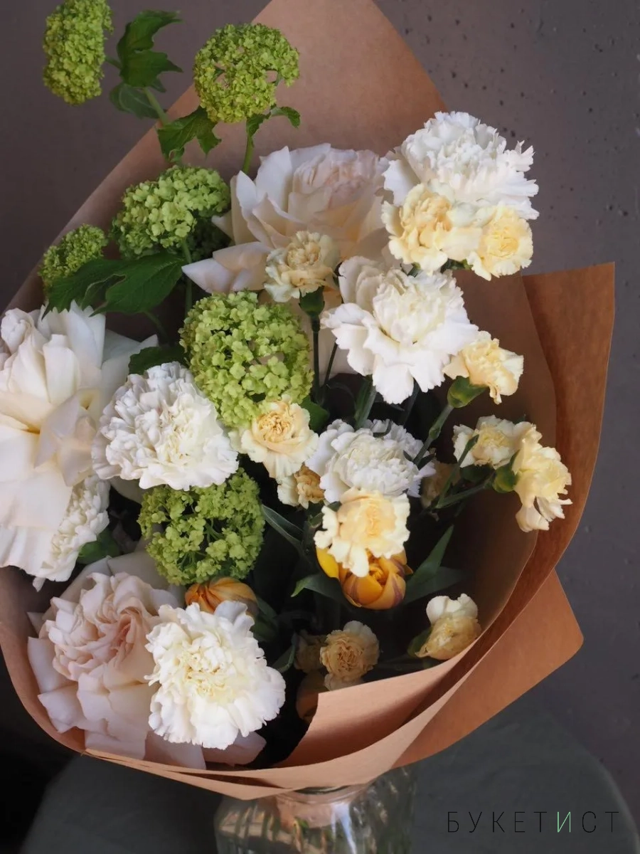 В составе букета: кустовые гвоздики, пионовидные тюльпаны, вибурнум и ажурные розы кремового оттенка.
