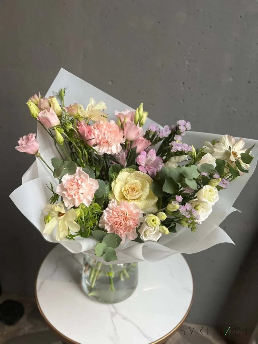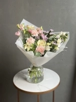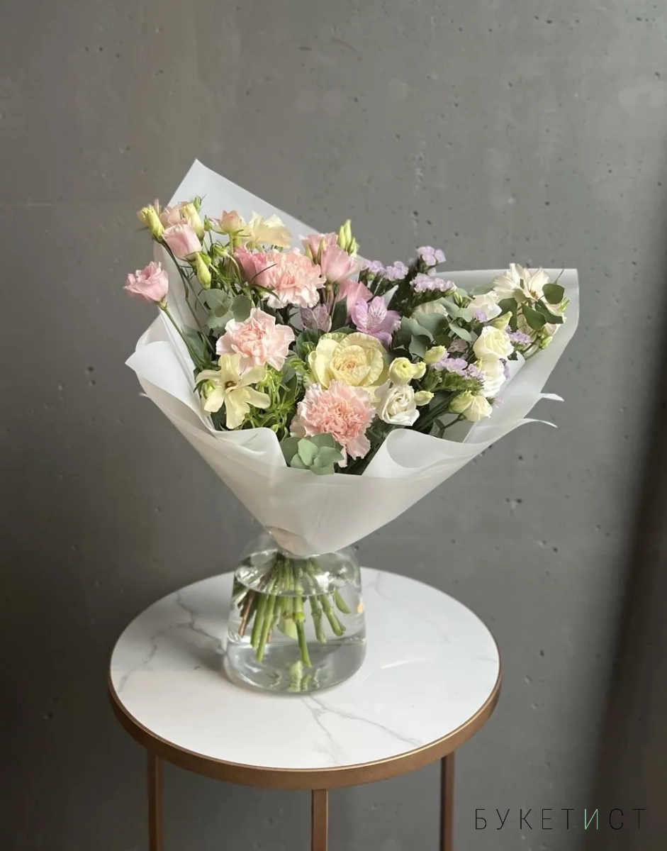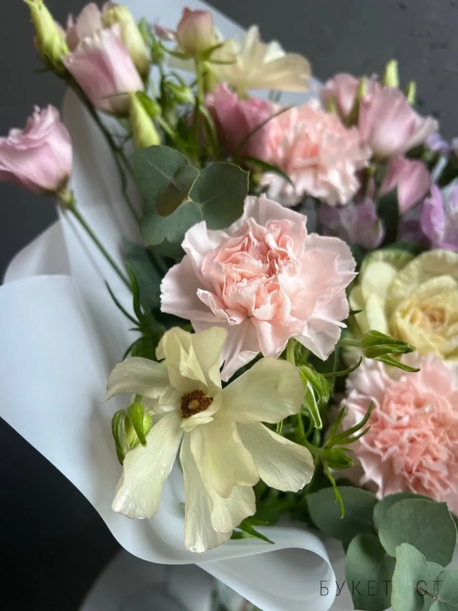 В составе букета: статица, нежные диантусы, ранункулюсы Батерфляй, эустома, брассика, альстромерия и душистый эвкалипт.